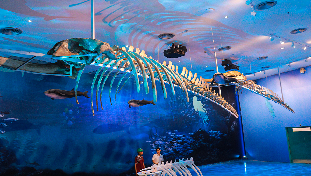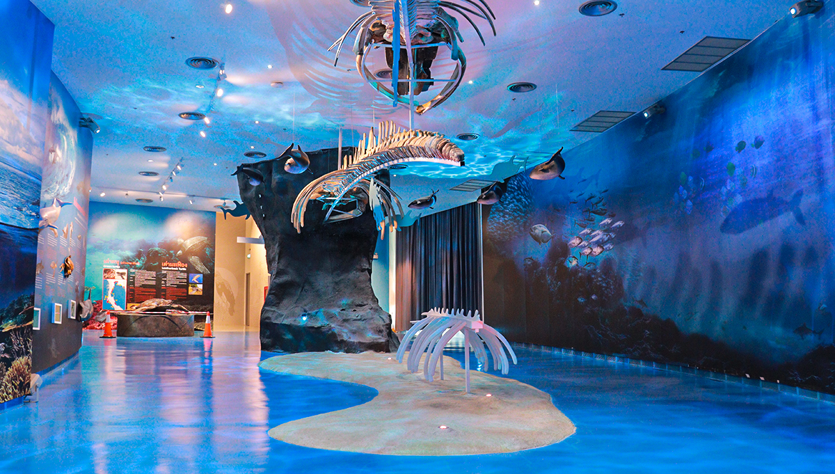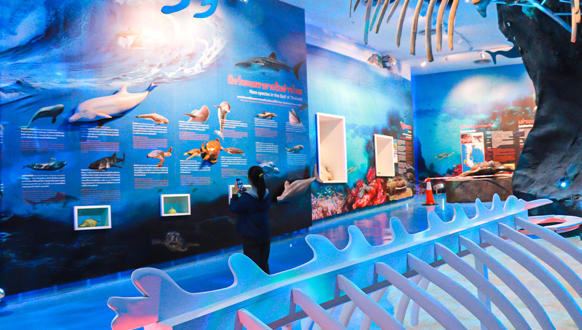 Featuring an aquarium of marine animals enhanced with lighting and sound effects, this room also houses a large whale skeleton and showcases research findings and academic services supported by the Plant Genetic Conservation Project (RSPG) and Walailak University. A notable project highlighted is the “Sea Cucumber Bank: Sustainable Conservation and Utilization of Sea Cucumbers,” undertaken in collaboration with regional partners.