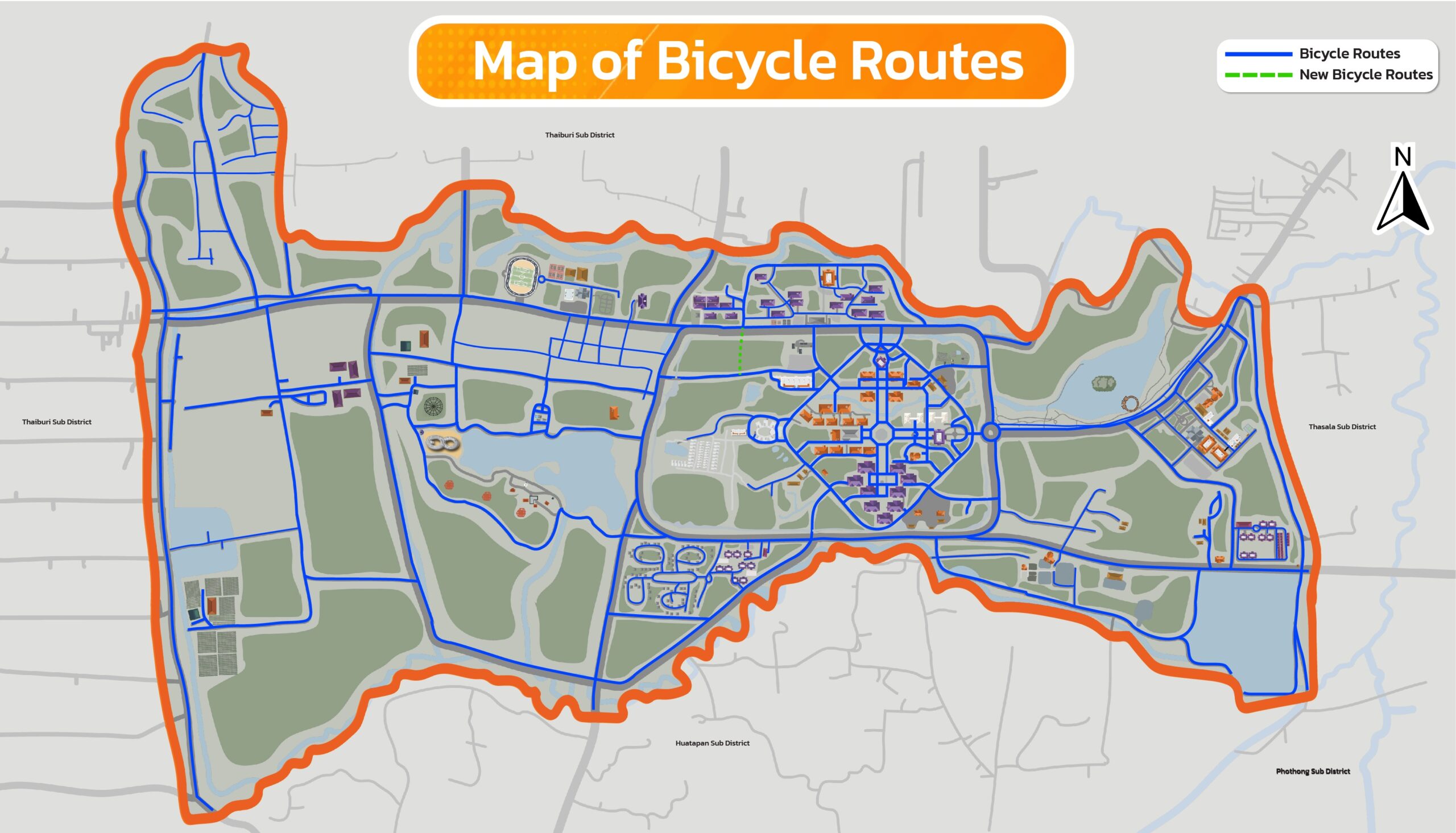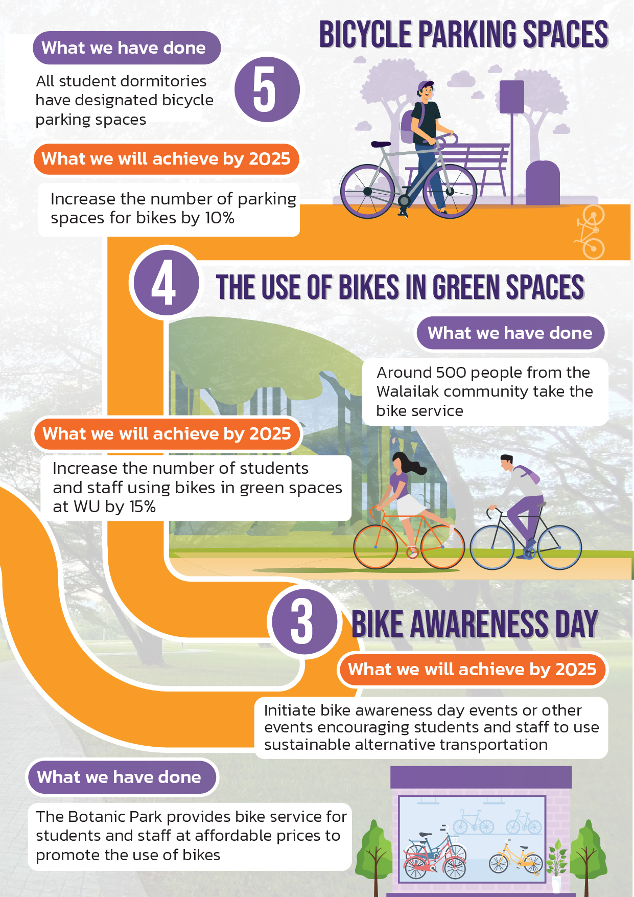 In 2024, Walailak University constructed a bike lane connecting the student dormitories with the Architecture and Design Building, providing students and staff with a convenient and sustainable option for commuting by bicycle.