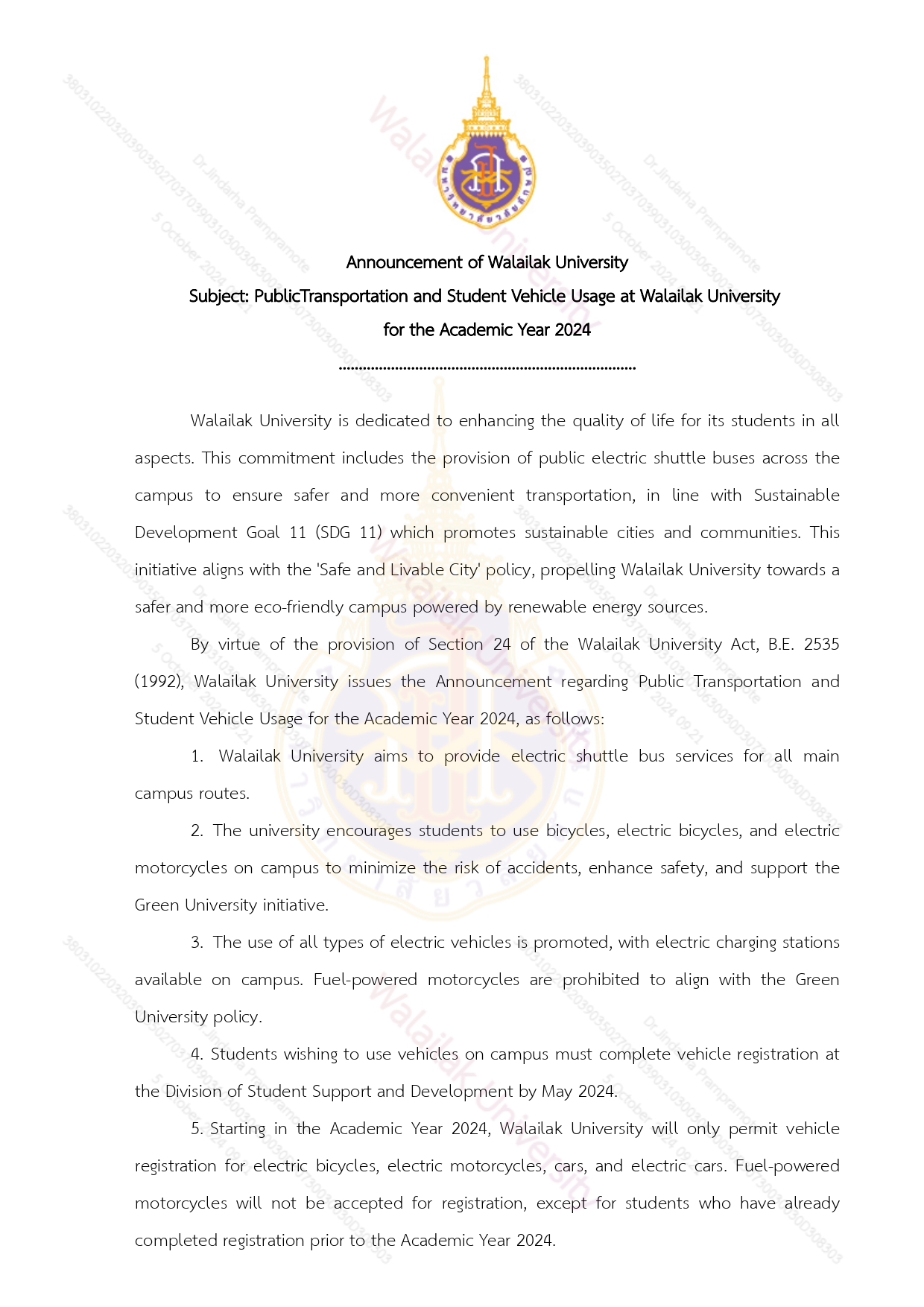 Walailak University continued its campaign encouraging first-year students to avoid using fuel-powered motorcycles, promoting sustainability on campus. In 2024, a total of 344 electric motorbikes were used by students, providing an eco-friendly and convenient mode of transportation across campus.