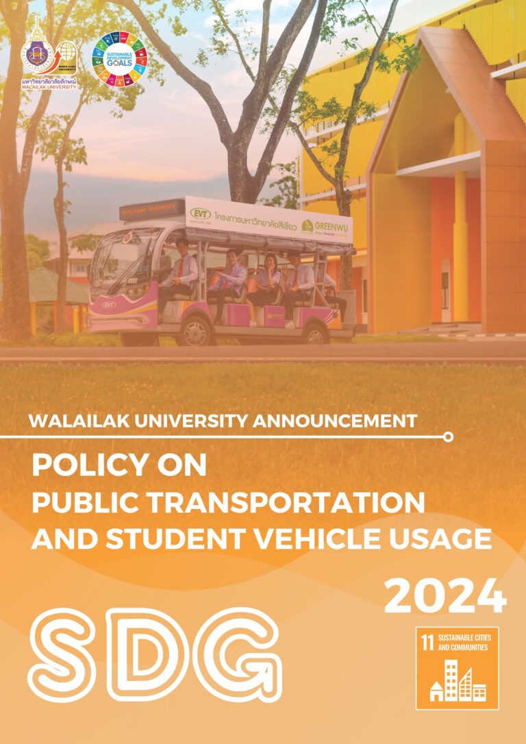 Walailak University prioritizes measuring and setting targets to drive sustainable commuting both off and on campus. In 2024, Walailak University issued a policy on public transportation and student vehicle usage. This policy was issued to promote the measures for sustainable commuting on campus, which aligns with the 13th National Economic and Social Development Plan (2023–2027). The policy focuses on promoting the use of electric vehicles and supporting public transportation systems with low carbon emissions for the students, staff, and the general public at Walailak University.
