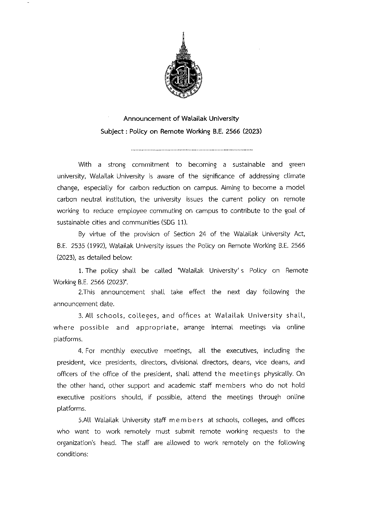 At Walailak University, the Policy on Remote Working has been in place as part of its ongoing commitment to environmental sustainability and staff well-being. The policy aims to promote flexible work arrangements among university staff, enabling remote work where applicable. Consequently, the university promotes and allows telecommuting or remote working for employees in accordance with tis policy. The university also provides guidelines encouraging staff to work efficiently, thereby reducing commuting time to the workplace. By reducing unnecessary daily commuting, the university not only alleviates traffic congestion on campus but also contributes to reducing greenhouse gas emissions associated with personal vehicle use.