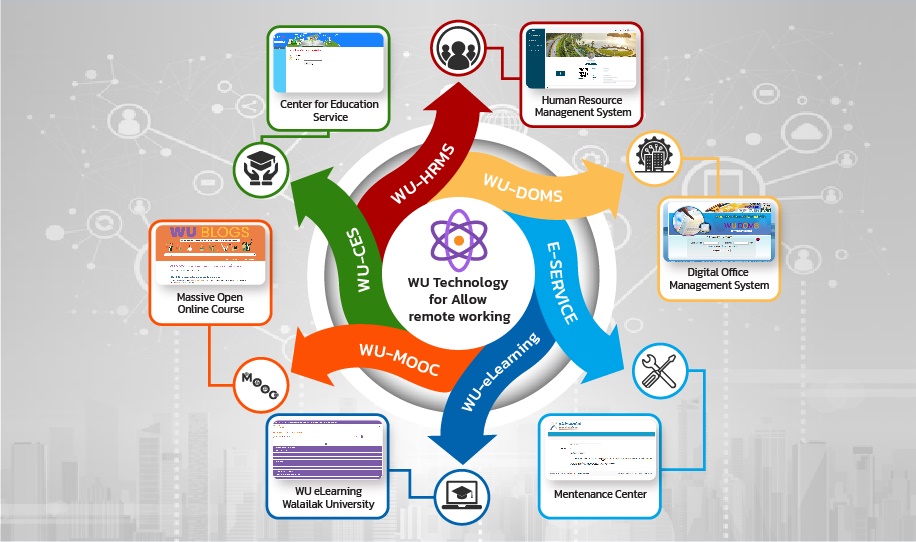 Walailak University has been actively developing a range of digital systems to support remote working, enhance operational efficiency, and promote sustainability. These electronic systems reduce the need for on-campus travel and significantly decrease the consumption of physical resources such as paper and ink. Key systems developed include the Digital Office Management System (DOMS), Electronic Service System (E-Service), Human Resources Management Information System (WU-HRMS), and the Center for Educational Service System (WU-CES).