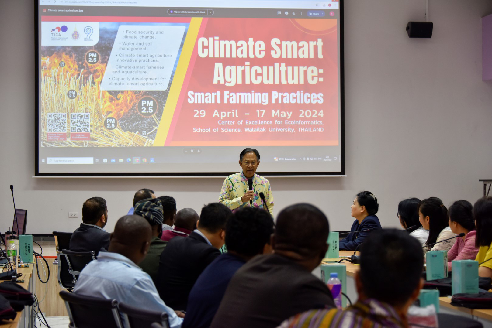 Assoc. Prof. Dr. Krisanadej Jaroensutasinee focused on cutting-edge drone mapping technology for monitoring crops and assessing soil fertility. His sessions explored the integration of sensor technology and IoT applications in climate-smart agriculture, enabling farmers to optimize farm management and adapt to environmental changes. He also discussed the role of weather forecasting and advanced monitoring systems in improving agricultural productivity and resilience against climate variability.