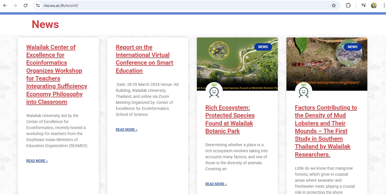 The Center of Excellence for Ecoinformatics at Walailak University, led by Assoc. Prof. Dr. Krisanadej Jaroensutasinee is dedicated to advancing research, knowledge development, and the application of Ecoinformatics to support technological solutions for community and national development. For over five years, the center has been actively engaged in research projects and forming international partnerships to address various Sustainable Development Goals (SDGs). With a team of 19 experienced researchers, experts, and scientists, the center strives to be a leading institution in Thailand for human resource development, research excellence, and innovation in Ecoinformatics.