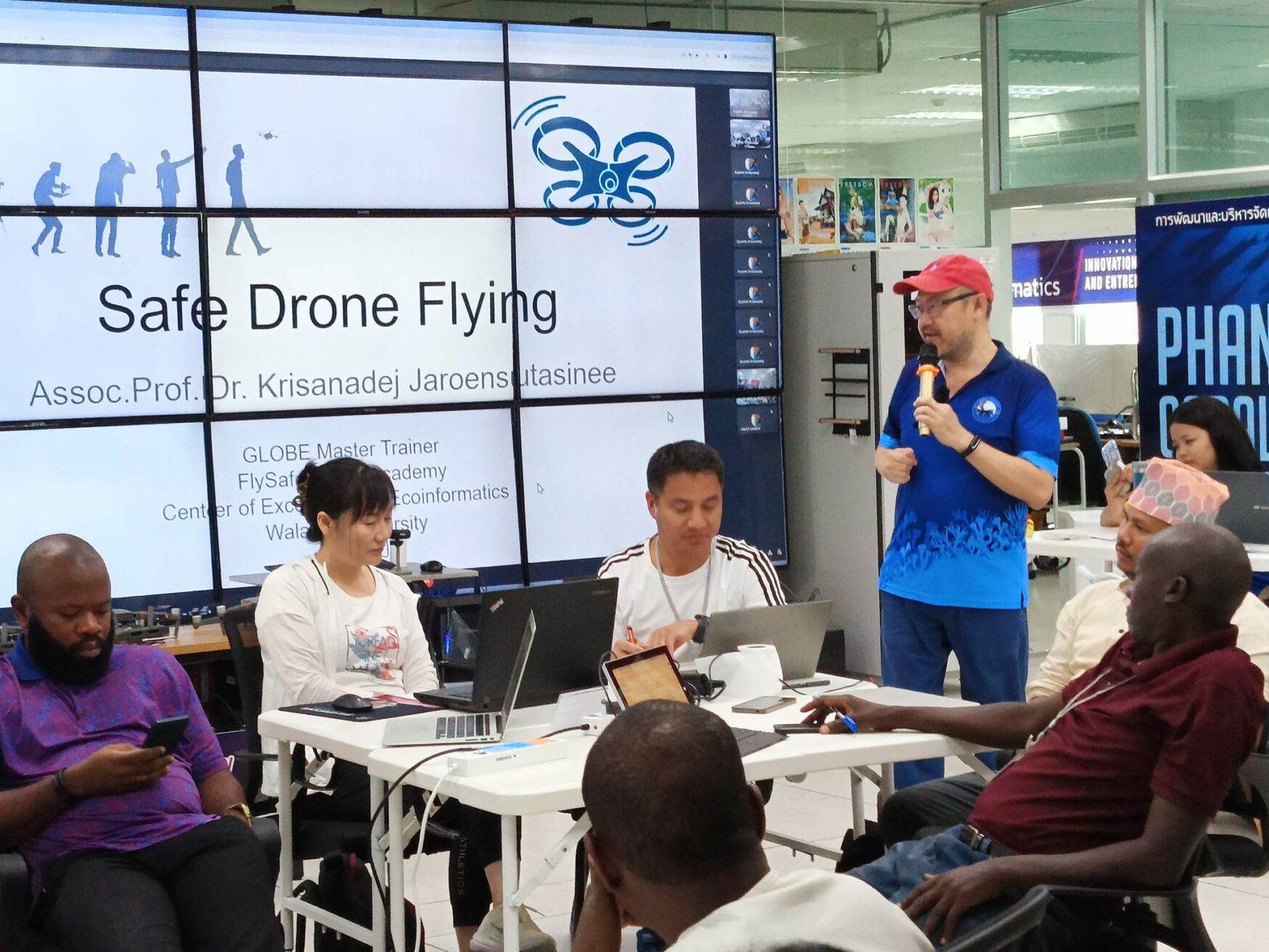 Figures: Assoc. Prof. Dr. Krisanadej Jaroensutasinee giving lectures on using drones for sustainable agricultural practices