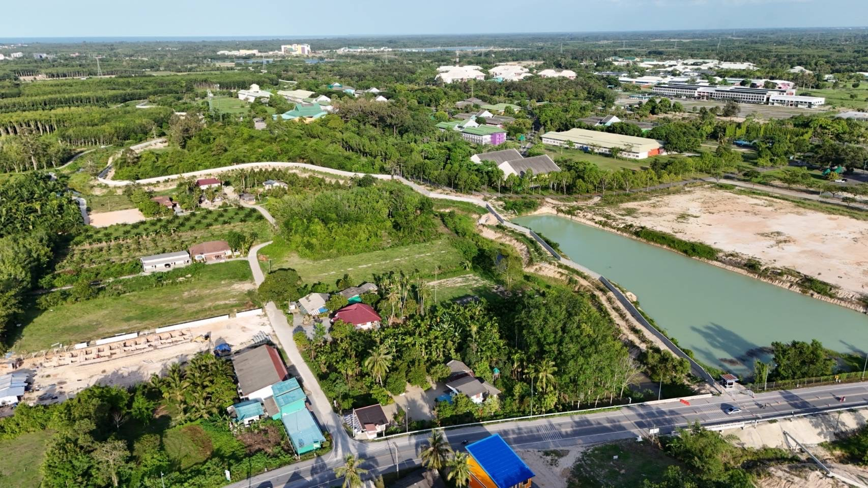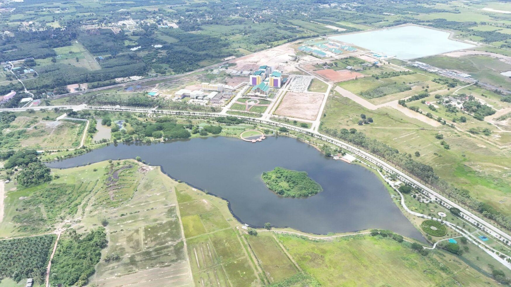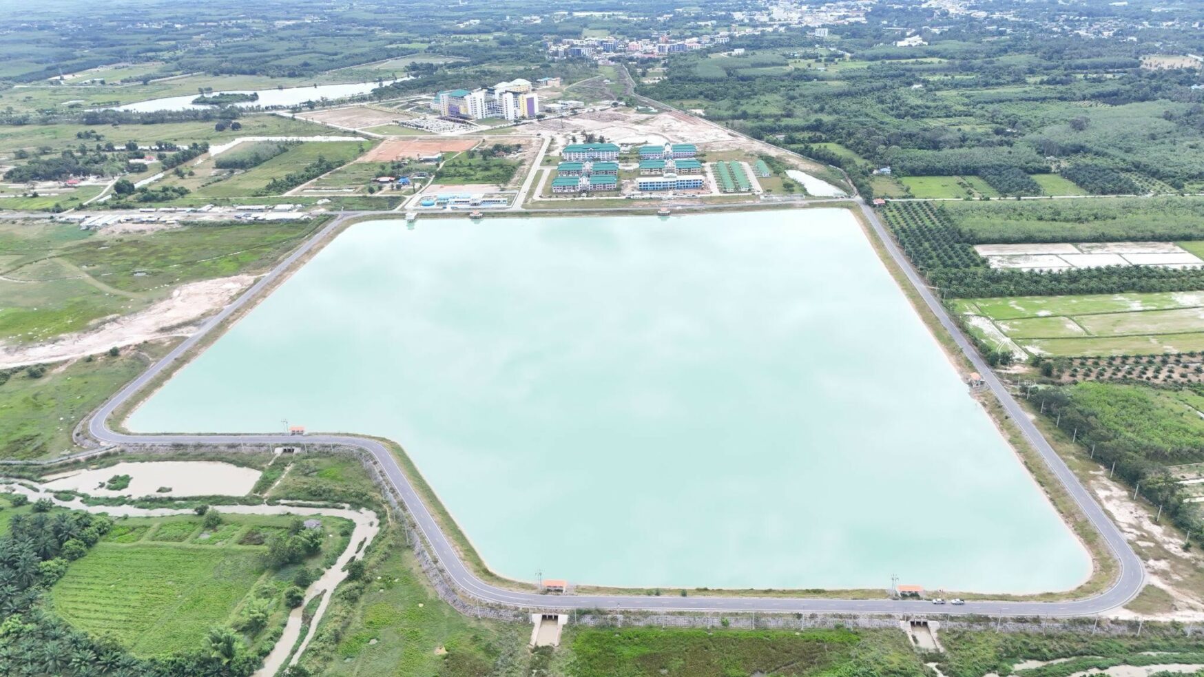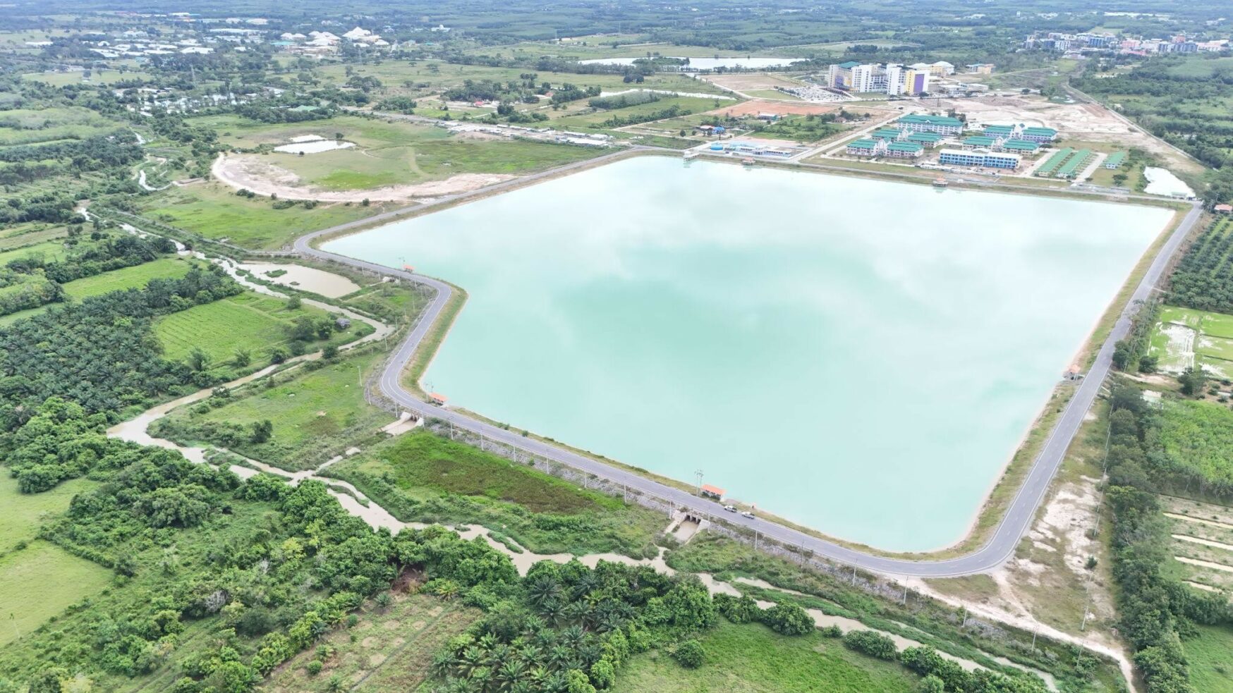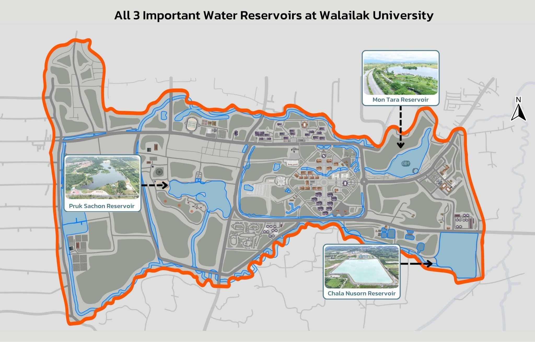 The Chala Nusorn Reservoir covers an area of 329,385 square meters with a water storage capacity of 4,940,775 cubic meters. It was constructed in 2022 for the purposes of irrigation and flood level control. By 2024, it has become widely known as the “Reservoir behind the Walailak University Hospital.” The Chala Nusorn Reservoir functions as an essential “monkey cheek” system that plays a crucial role in addressing water-related issues for both Walailak University and the surrounding communities. The reservoir effectively contributes to flood prevention, reduces the volume of floodwater affecting nearby areas during the rainy season, and serves as a strategic water infrastructure for the future. It acts as a catchment area for rainwater runoff from surrounding lands before it enters the main drainage system, thereby reducing the amount of wastewater that directly reaches the treatment system and enhancing its overall efficiency. This project was jointly implemented by Walailak University and the 7th Machinery Administration Office, Royal Irrigation Department. It represents a significant long-term investment, not only mitigating flooding and drought problems but also ensuring water security for domestic use, agriculture, and the sustainable growth of both the university and neighboring communities.