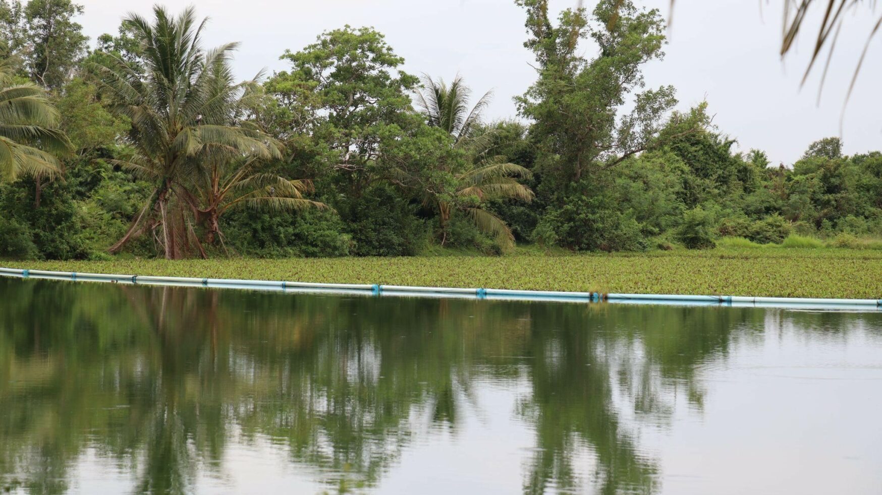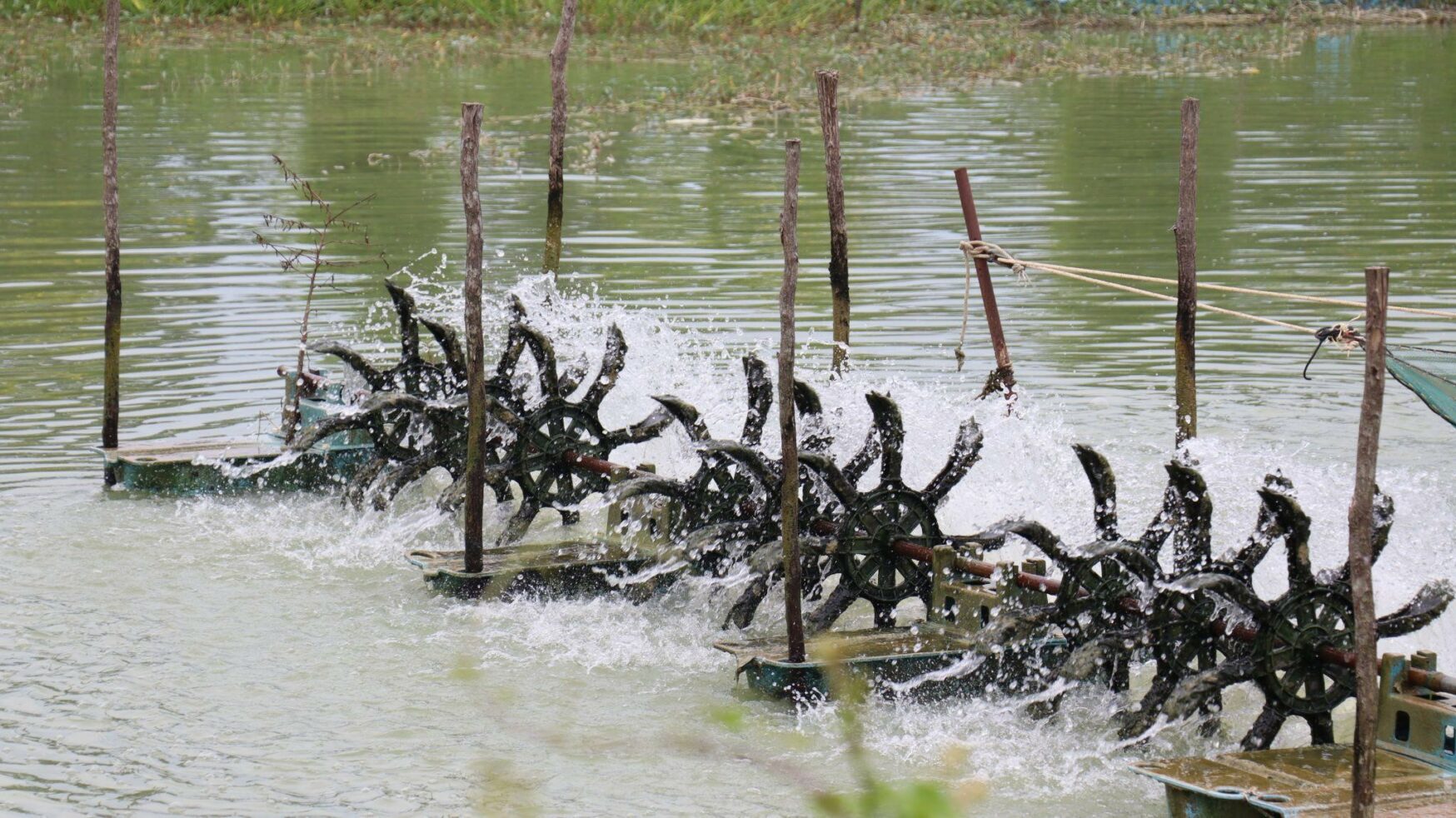 The wastewater is pumped into the aerated lagoon, which serves as the core of the wastewater treatment system. Walailak University’s aerated lagoon is large, with a depth of approximately 5 meters and a capacity of up to 18,903 cubic meters. It is equipped with four 15-kilowatt low-speed float-type surface aerators that function to increase the oxygen level in the water. These aerators agitate the water to enhance contact with oxygen, promoting thorough mixing within the lagoon. This process enables aerobic microorganisms to efficiently decompose organic matter in the wastewater, resulting in up to a 70% reduction in biochemical oxygen demand (BOD).