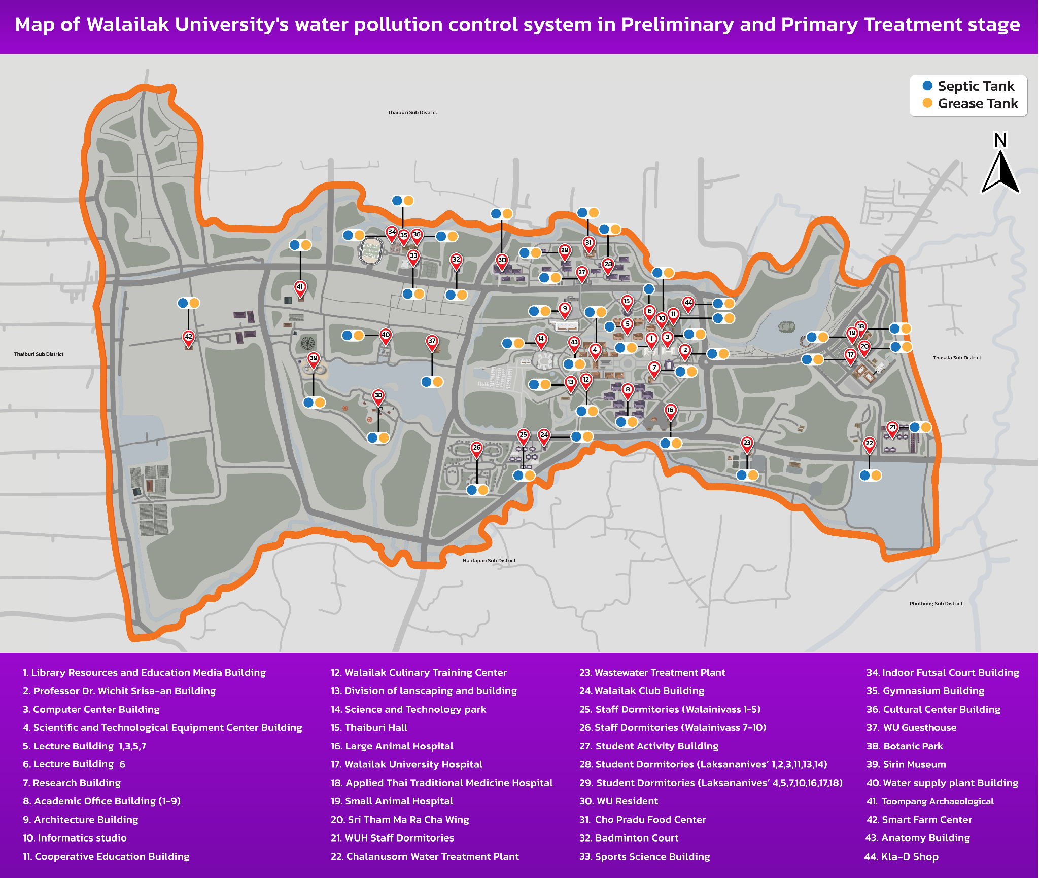 Wastewater that has been separated from solid waste and grease in all buildings is pumped and collected for treatment under the Wastewater Management System Development Project of Walailak University.