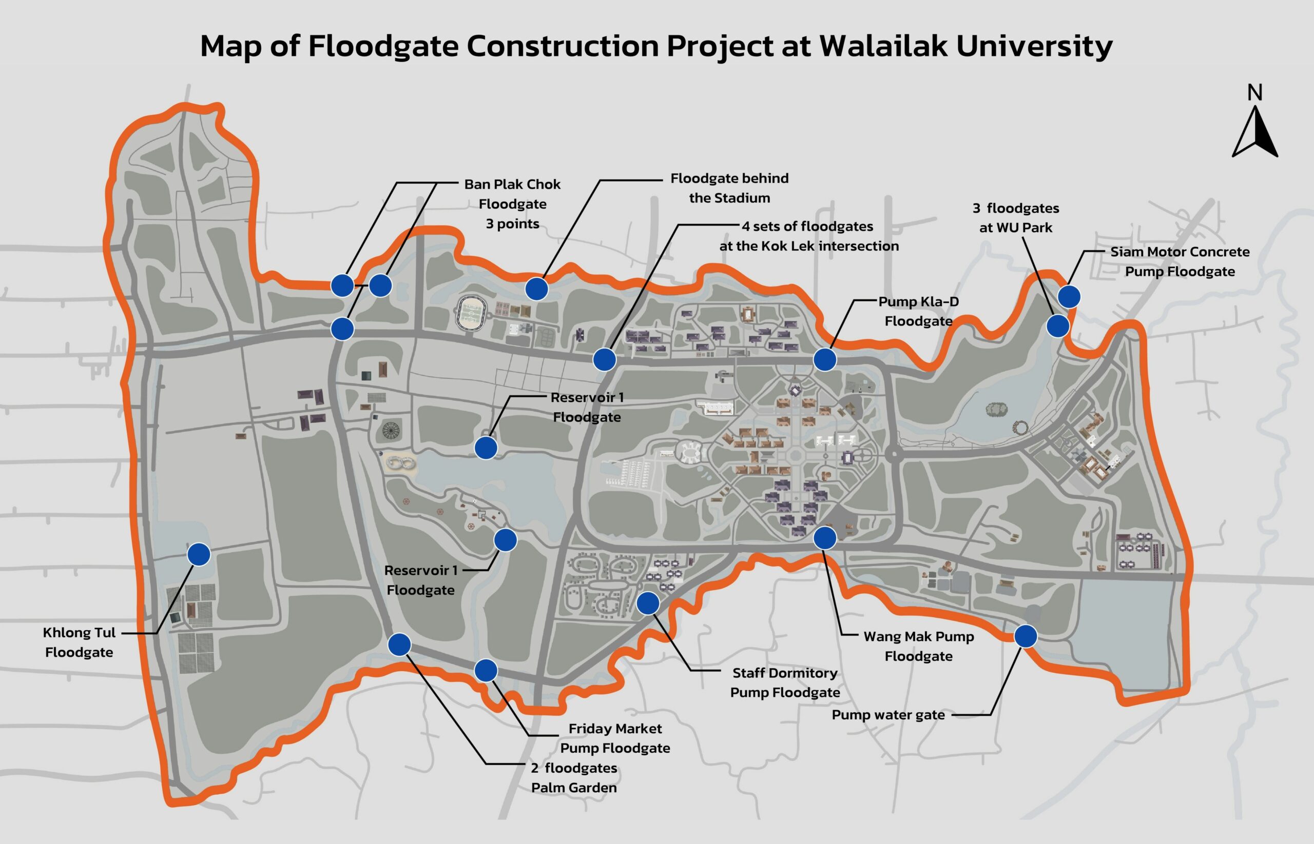 In 2024, two additional sluice gates were constructed behind Walailak University’s Sports and Health Center to mitigate flooding during the rainy season. At present, the university has a total of 20 sluice gates for flood prevention. Monthly inspections are conducted to ensure that the sluice gates function properly and operate at maximum efficiency.