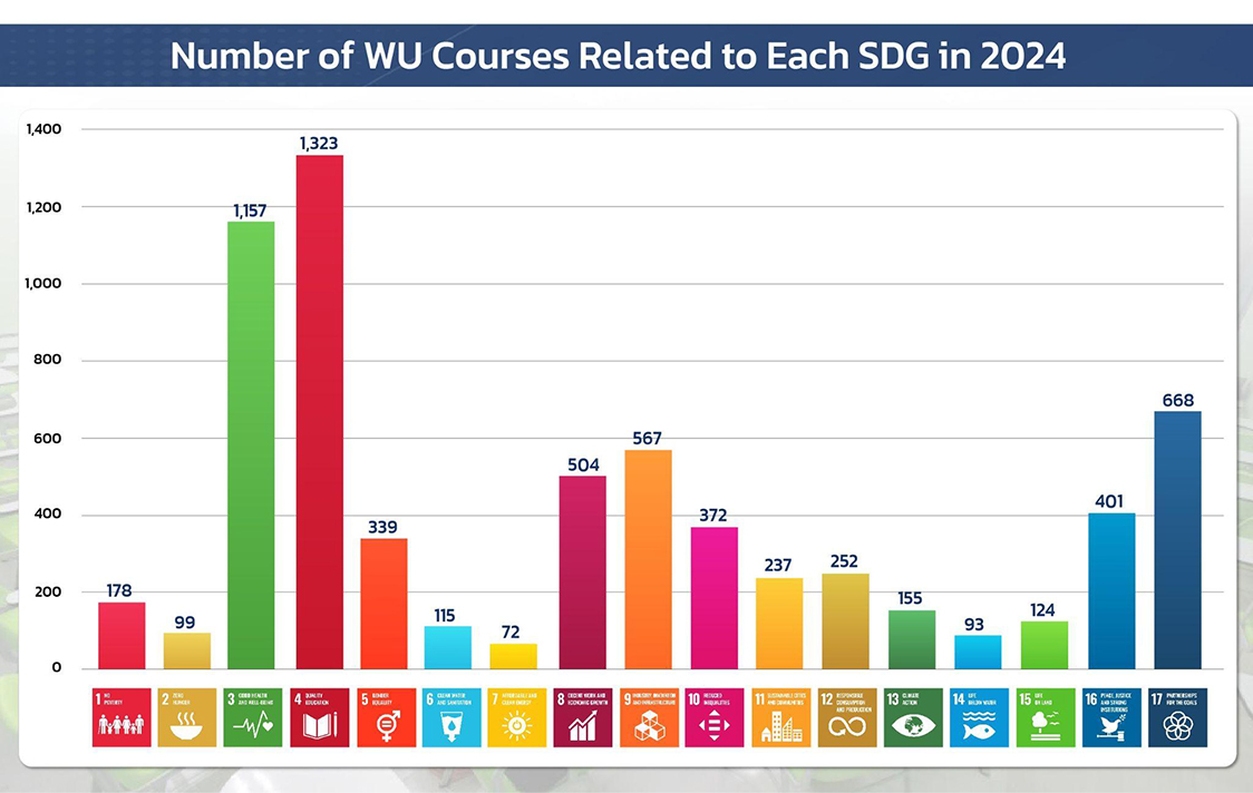In 2024, Walailak University expanded its curriculum by integrating 650 new subjects aligned with the United Nations Sustainable Development Goals (SDGs), bringing the total to 2,867 SDG-related subjects. This initiative ensures that students across all disciplines are immersed in sustainable development principles, fostering a deep understanding of global challenges. By embedding SDG-focused content into teaching and learning, the university equips students not only with knowledge but also with practical skills to address pressing environmental, social, and economic issues. This holistic approach prepares graduates to become responsible global citizens, ready to contribute meaningfully to the achievement of the SDGs in their careers and communities.