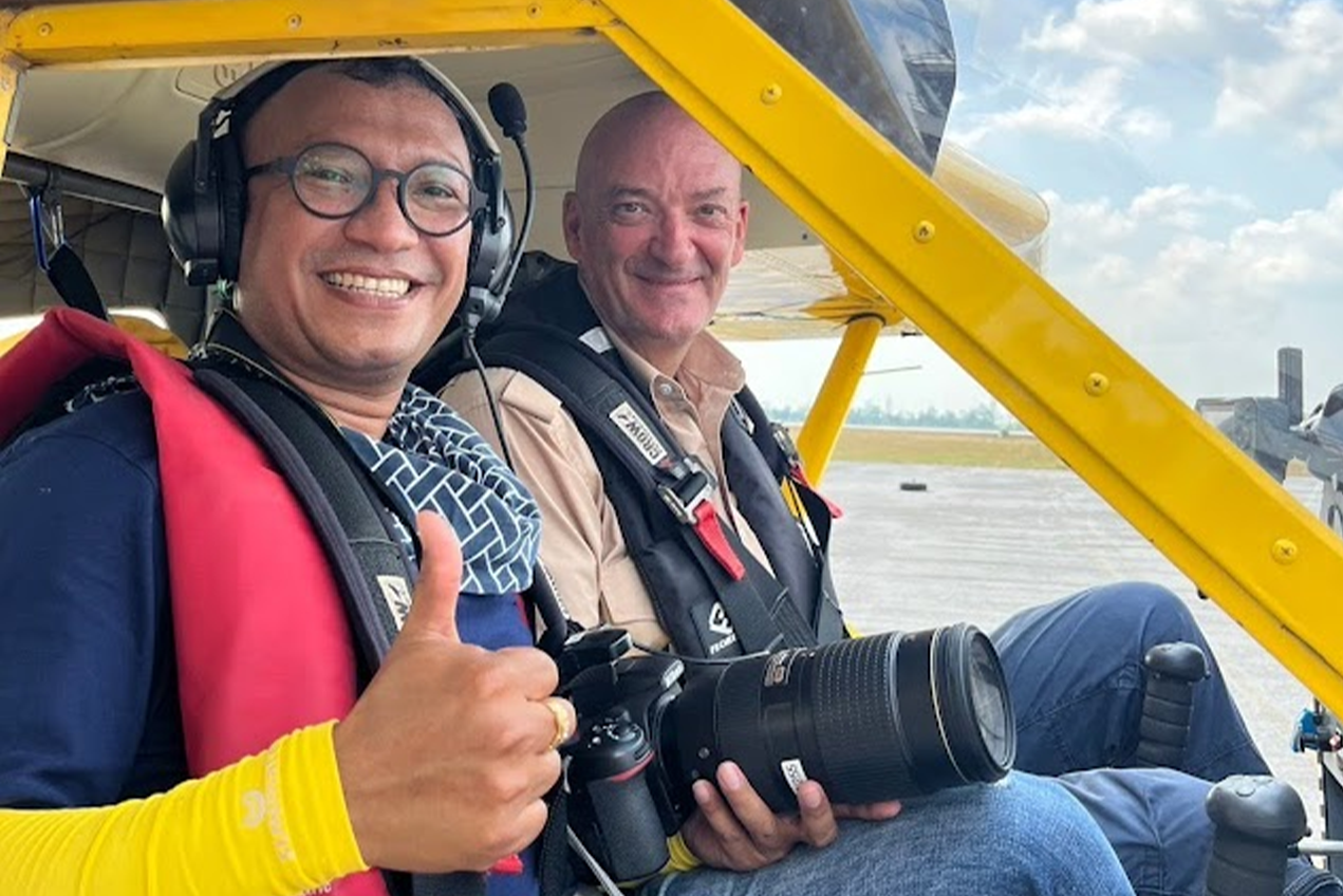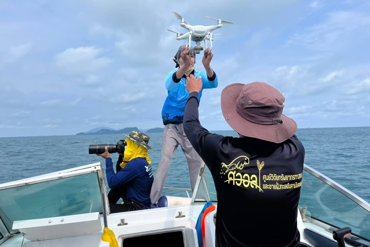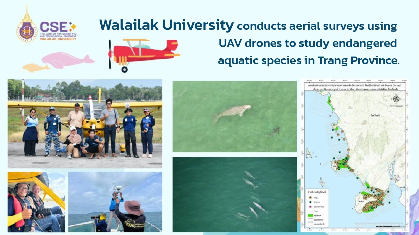 Walailak University conducted comprehensive aerial and marine surveys to study and conserve rare marine species along the coast of Trang Province. The research team employed a two-seater fixed-wing aircraft to perform line transect surveys, in collaboration with volunteer pilot Mr. Eduardo Angelo Loigorri, enabling the collection of high-resolution data across extensive marine zones. Complementing the aerial survey, unmanned aerial vehicles (UAV-drones) were deployed to monitor marine habitats around Libong Island, Muk Island, and the neighboring seagrass meadows, ensuring complete coverage of the province’s coastal ecosystems.