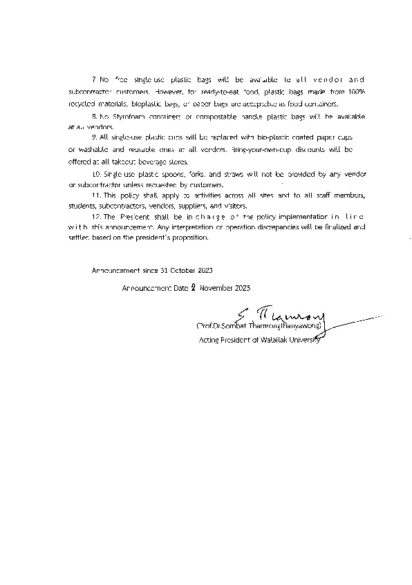 Walailak University officially issued this policy to encourage all stakeholders—students, staff, vendors, suppliers, and subcontractors—to minimize the use of single-use plastics and disposable items across the campus.