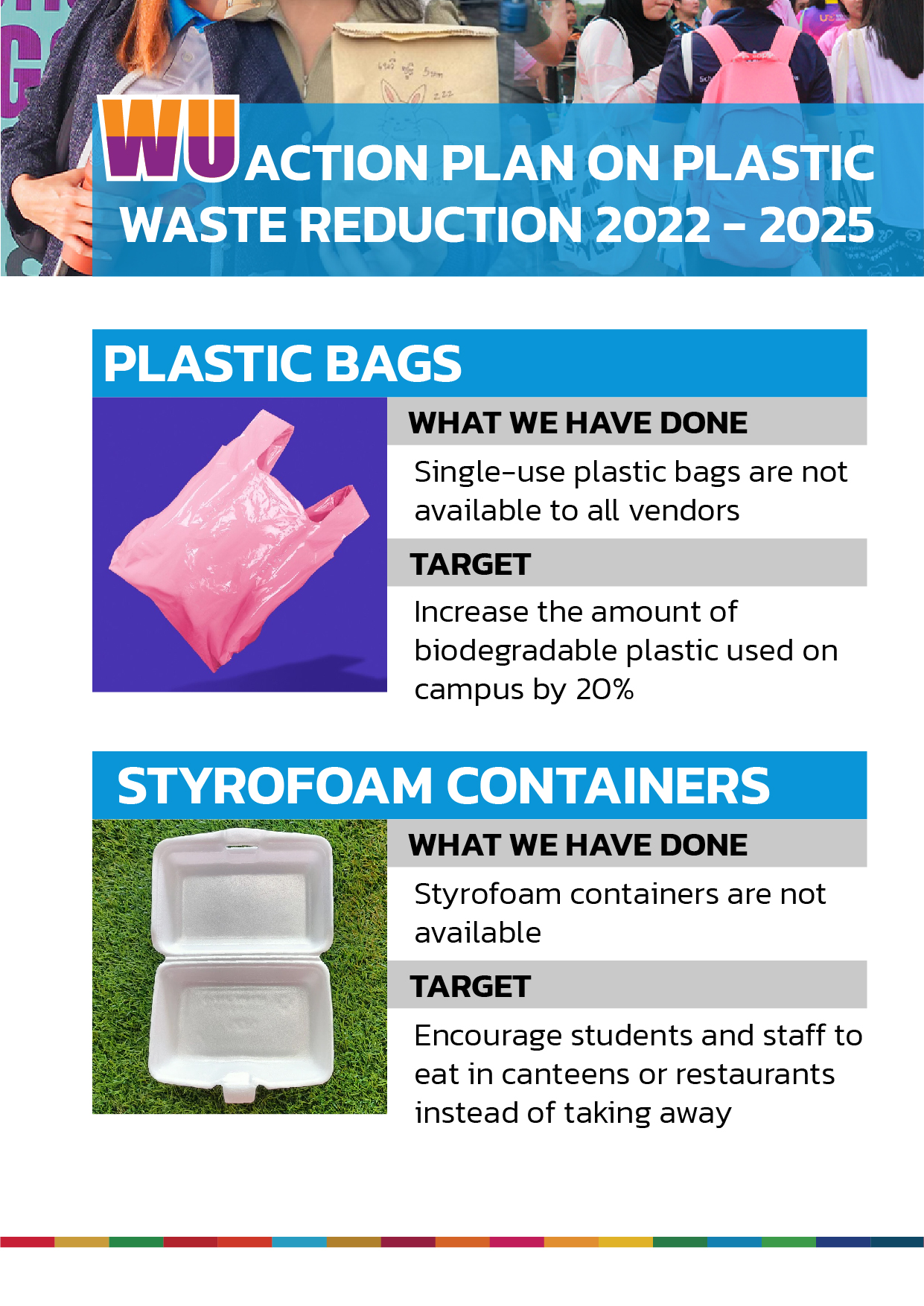 Plastic waste management measures have been implemented across WU Food Centers, shops, food kiosks, and restaurants. All vendors are prohibited from distributing handled plastic bags and foam containers, helping reduce waste at the source in line with the 3Rs principle: Reduce, Reuse, and Reject.