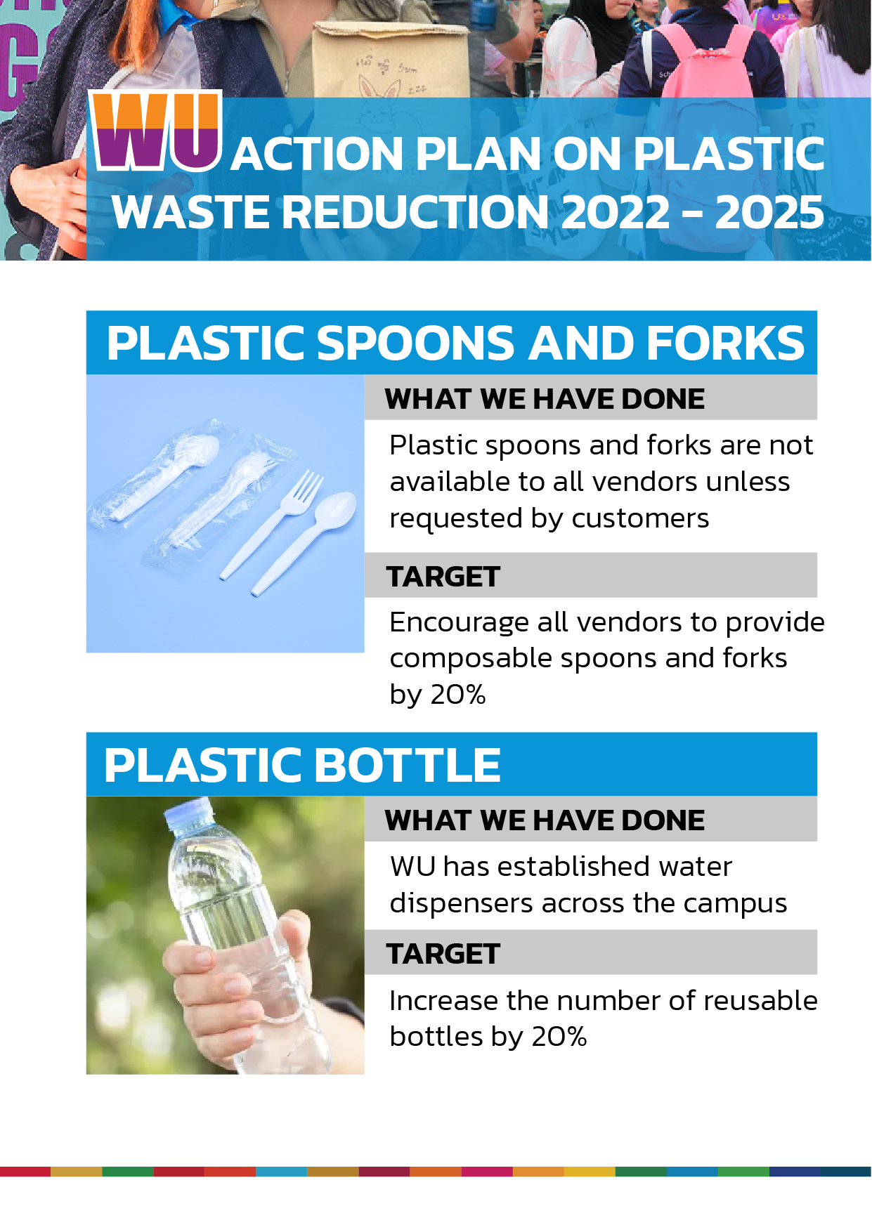 Under this policy, faculty members and students shall reduce the use of single-use plastic in their daily routines, while all WU organizations shall minimize the use of disposable materials and electrical equipment used for education and research purposes.