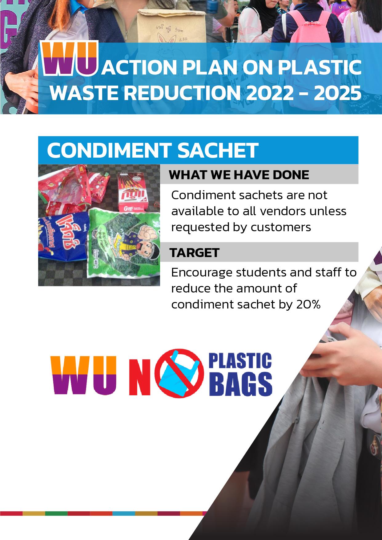 - WU applies the 5S principles (Sort, Set in order, Shine, Standardize, Sustain) to reduce plastic use in offices and actively promotes this policy across departmental websites.