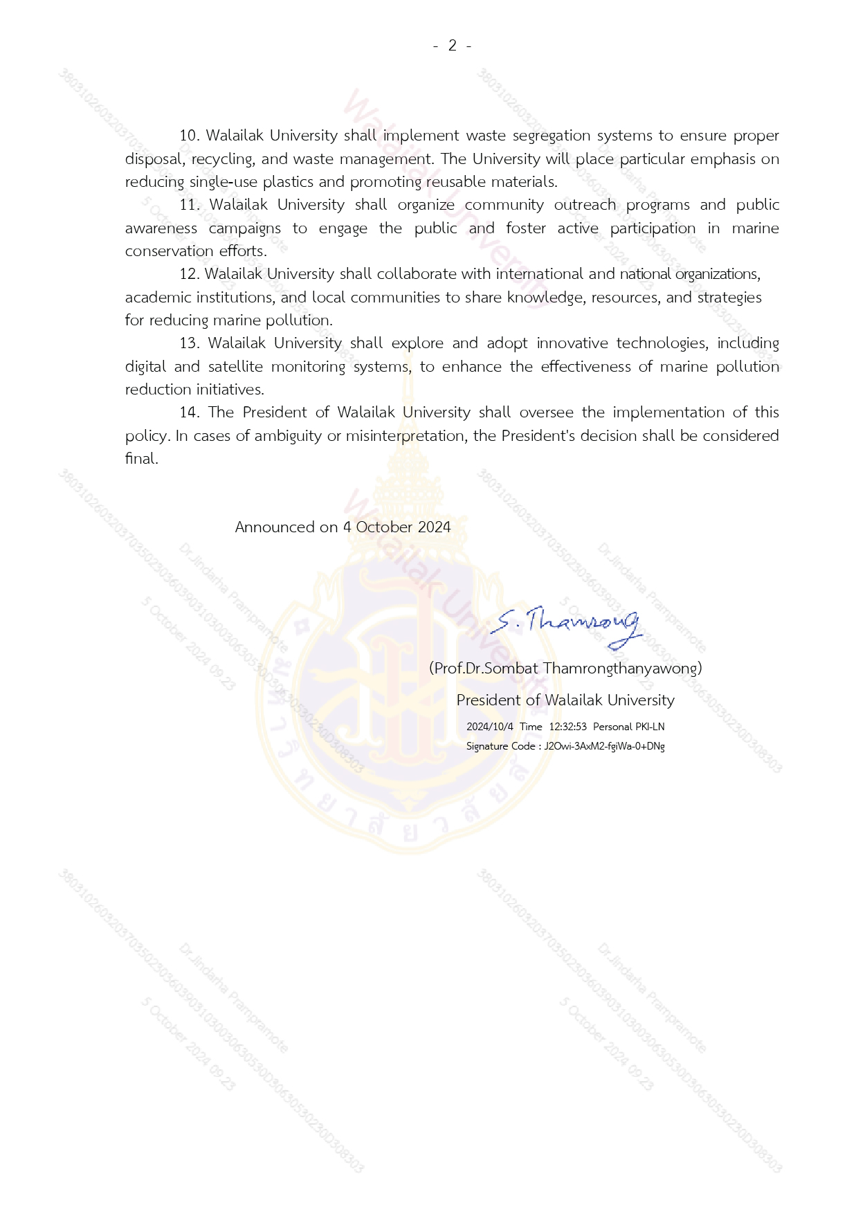 Furthermore, Walailak University shall promote proper waste segregation, recycling, and the use of reusable materials. Public awareness campaigns and community outreach activities shall be organized to encourage local participation in marine conservation. The university will also collaborate with national and international partners to exchange knowledge and strategies for marine pollution reduction. Innovative technologies, such as digital and satellite monitoring systems, shall be adopted to enhance implementation efficiency.