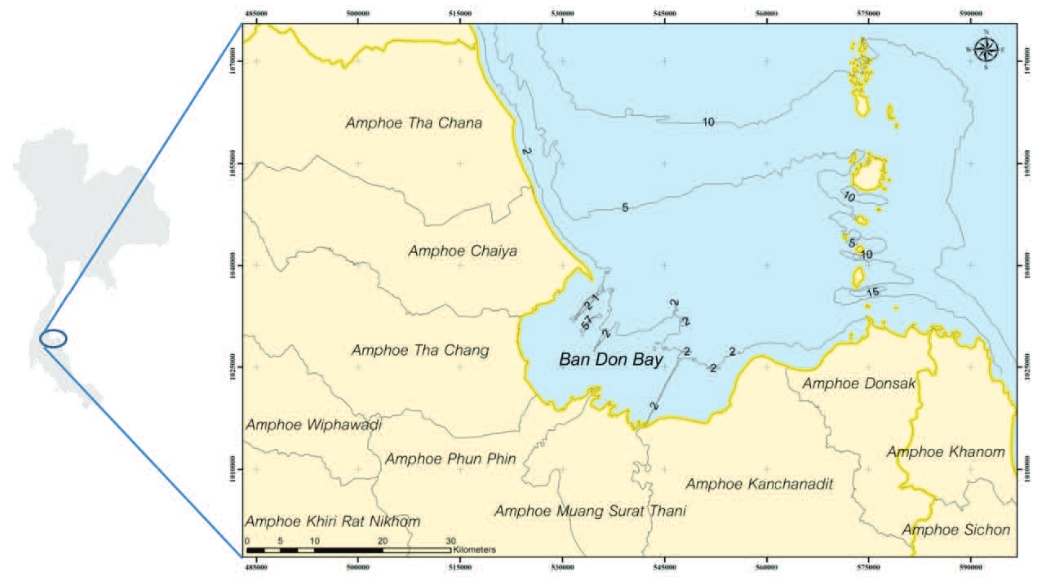 Bandon Bay, adjacent to WU, plays a critical role in supporting both local communities and marine biodiversity. To protect this vital ecosystem, WU researchers collaborate with government agencies and industry partners, including the Thai Frozen Foods Association (TFFA). Funded by the National Research Council of Thailand and ARDA, the research program evaluates water and sediment quality, fishing practices, and surrounding land use from agricultural and industrial activities.