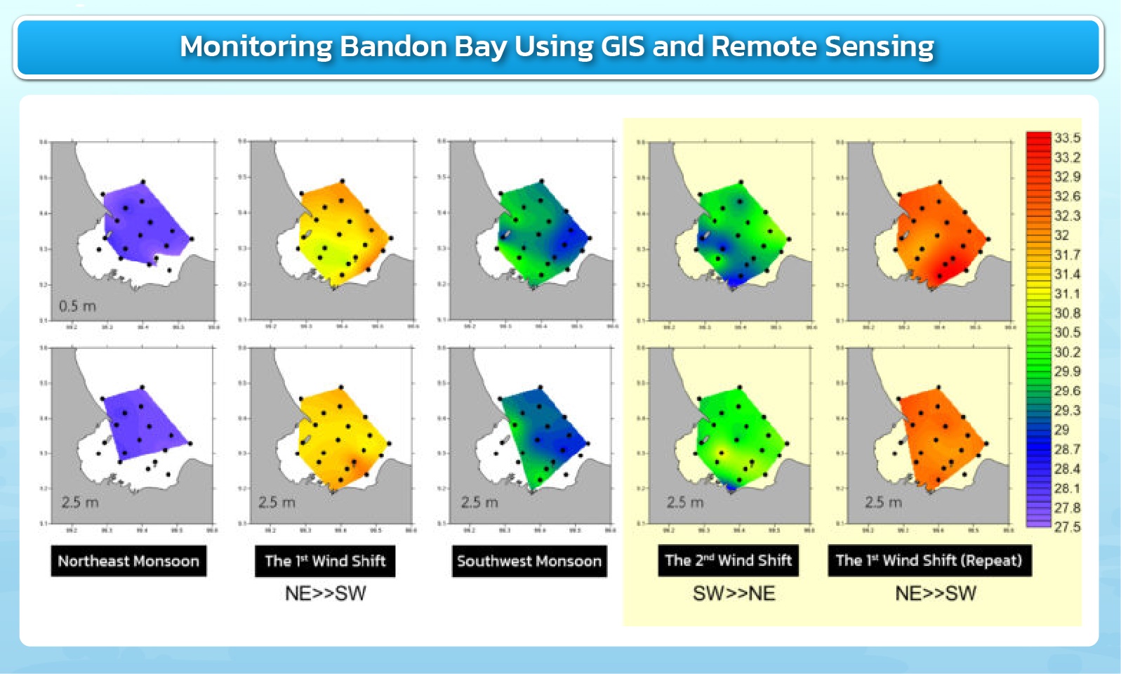 Walailak University (WU) is committed to safeguarding and monitoring the health of aquatic ecosystems in its surrounding areas through advanced scientific approaches. Strategically situated near key marine and freshwater resources, WU actively tracks ecosystem conditions to support sustainable management. The university employs cutting-edge technologies, including Geographic Information Systems (GIS), remote sensing, CTD sensor networks, and unmanned aerial vehicles (UAVs), to collect and analyze environmental data. The following highlights WU’s ecosystem monitoring efforts in Bandon Bay and the coral reef areas of Phuket.