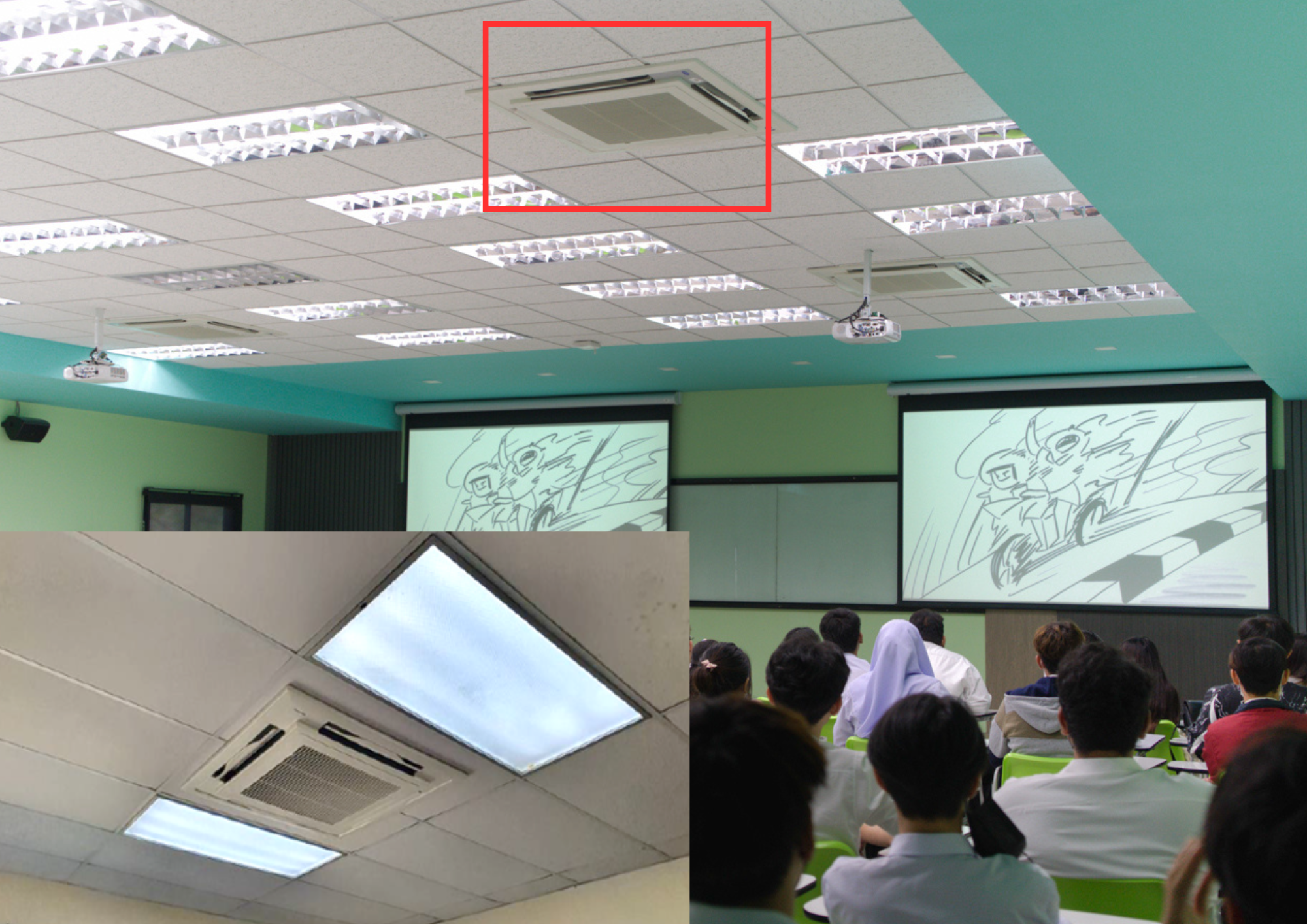 To further strengthen energy performance, the university introduced ceilingmounted air conditioning diffusers integrated with inverterdriven systems, which optimize airflow distribution and support intelligent environmental control. Additionally, automated control systems synchronized with class schedules, together with realtime temperature monitoring, were implemented to ensure optimal and sustainable energy management.
