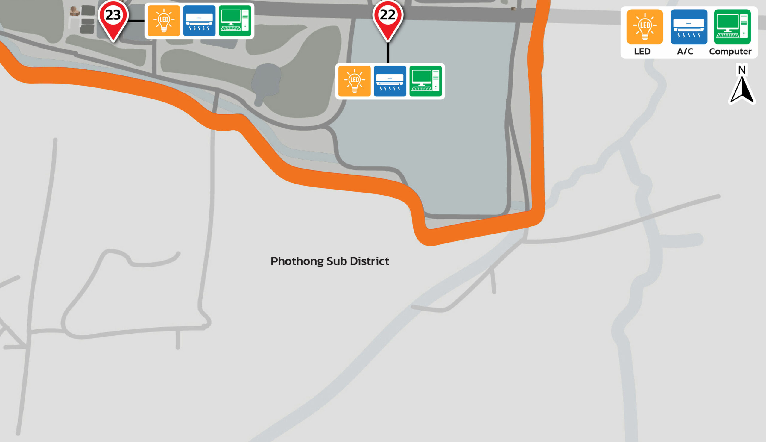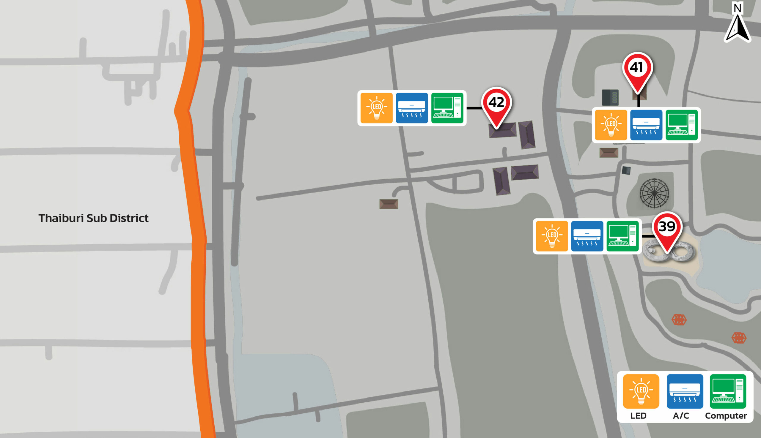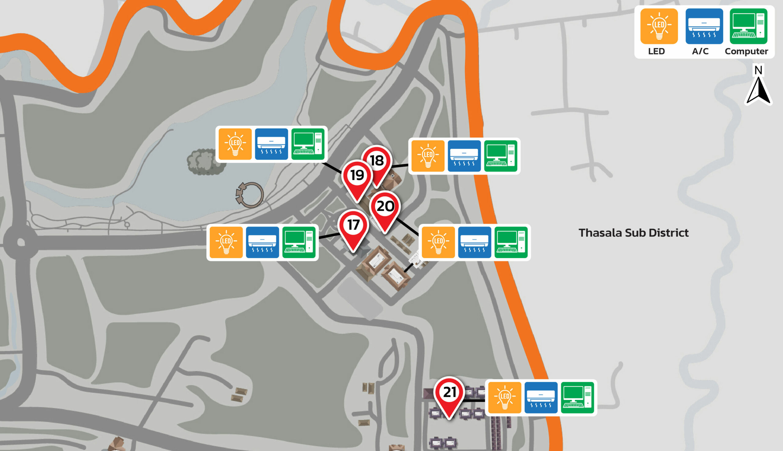 Figures: Distribution Map of Energy-Efficient Equipment 100% implemented across all buildings. (Walailak University, Thailand)