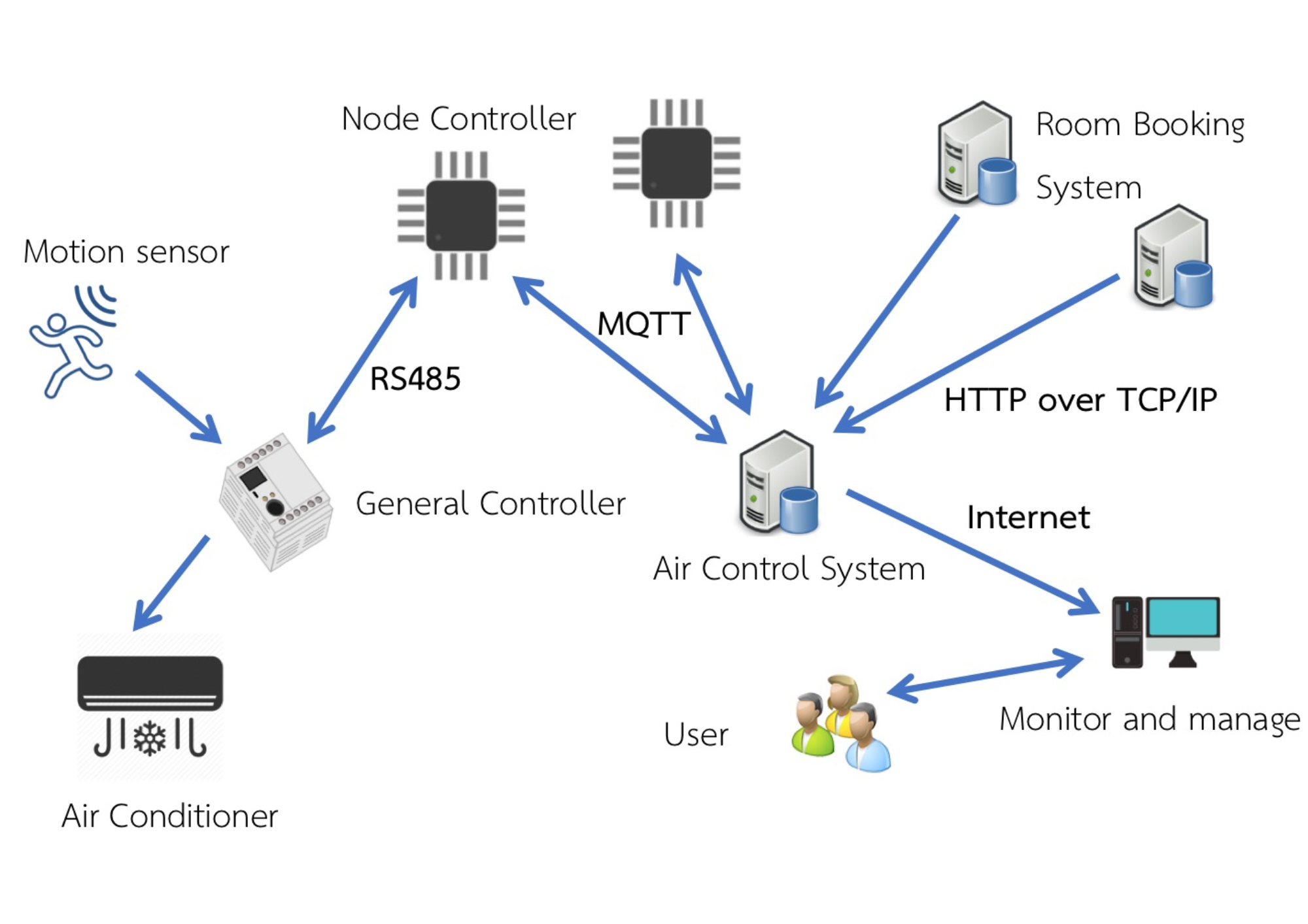 - Main Server Computer (Air Control System): This server contains software that communicates with other servers managing room usage schedules and other command or setting patterns from users. It also connects to microcontroller devices (Node Controllers) responsible for controlling sensors and switches.
