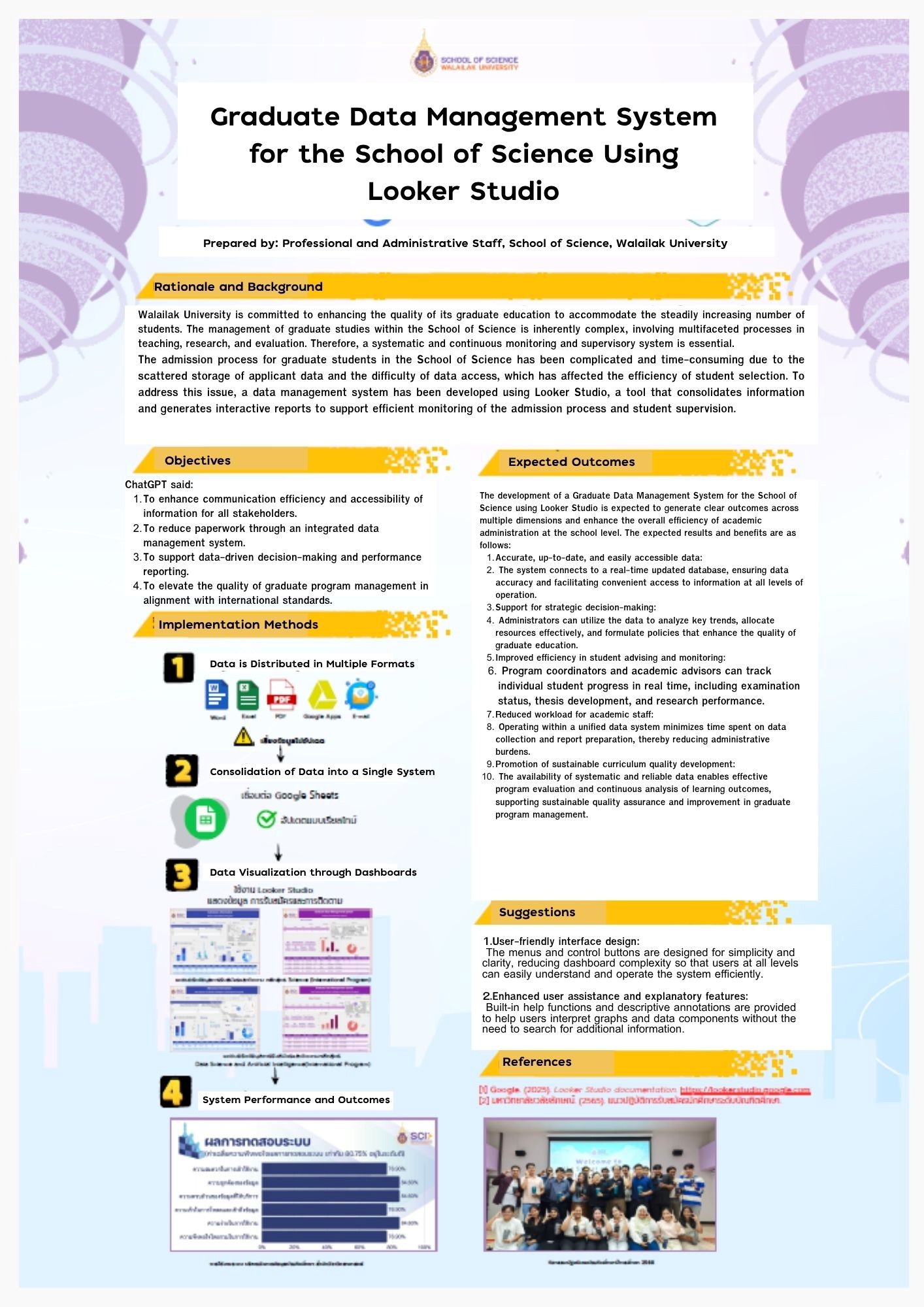 Walailak University organized “WU INNOVATION DAY 2025” as a platform to showcase innovative ideas and initiatives developed by internal departments. The objective of this event is to enhance work efficiency and foster the development of the university into a high-performance organization. It also provides an opportunity for staff members to present their innovations under the LEAN concept, which emphasizes reducing processes, saving time, and optimizing costs through creative problem-solving.
