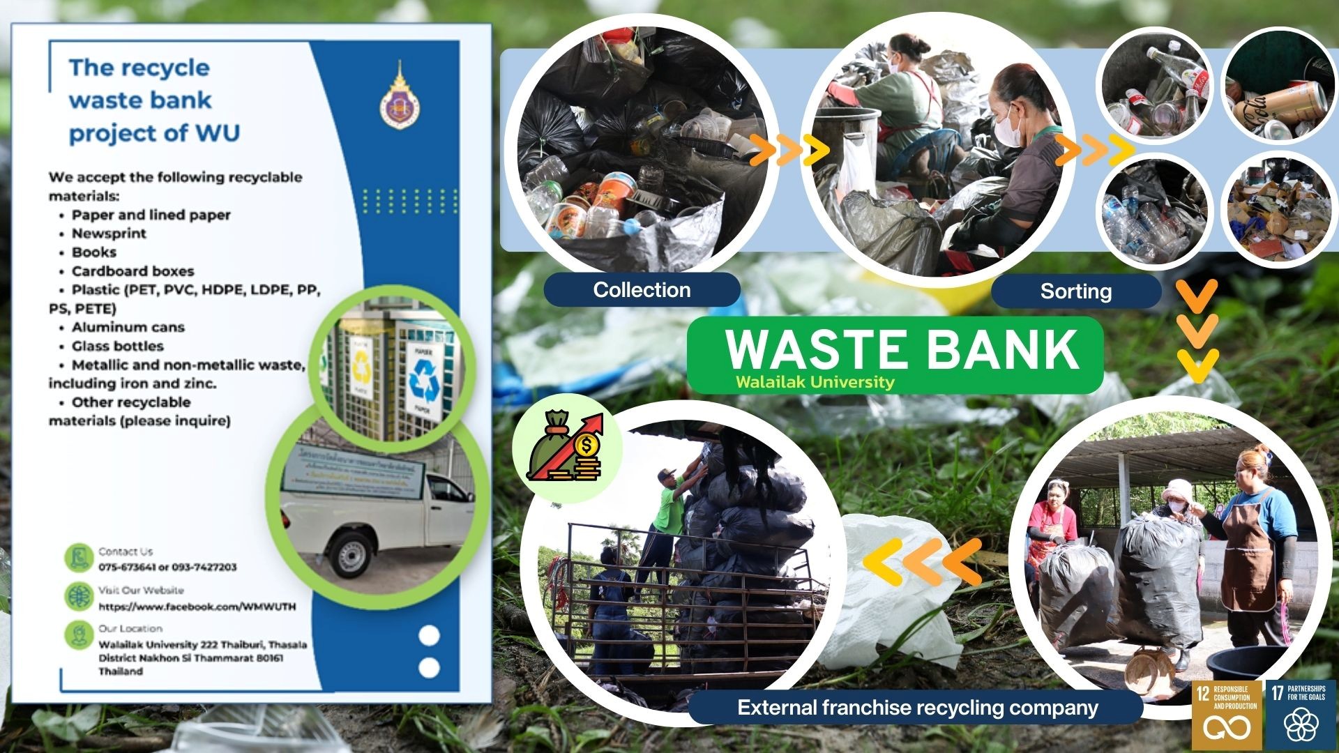 The project exemplifies Walailak University’s commitment to environmental stewardship and aligns with the Sustainable Development Goals (SDGs) as well as the UI GreenMetric Waste Management assessment criteria, reflecting best practices in waste reduction, resource efficiency, and sustainable campus management.