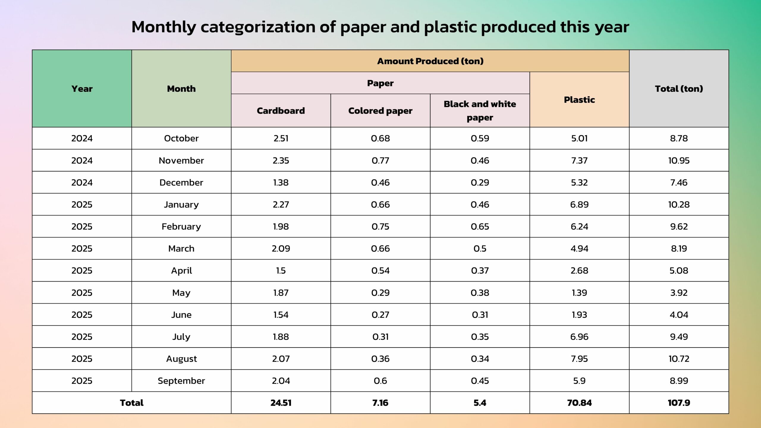 Walailak University has continuously collected and monitored data on the volume of waste generated from on-campus activities and operations. This information serves as a fundamental basis for planning resource management and minimizing environmental impacts. According to the monitoring results, the total paper waste generated amounted to 37.06 tons, comprising 24.51 tons of cardboard , 7.16 tons of colored paper and 5.40 tons of black and white paper, while the total plastic waste generated throughout the year amounted to 70.84 tons.