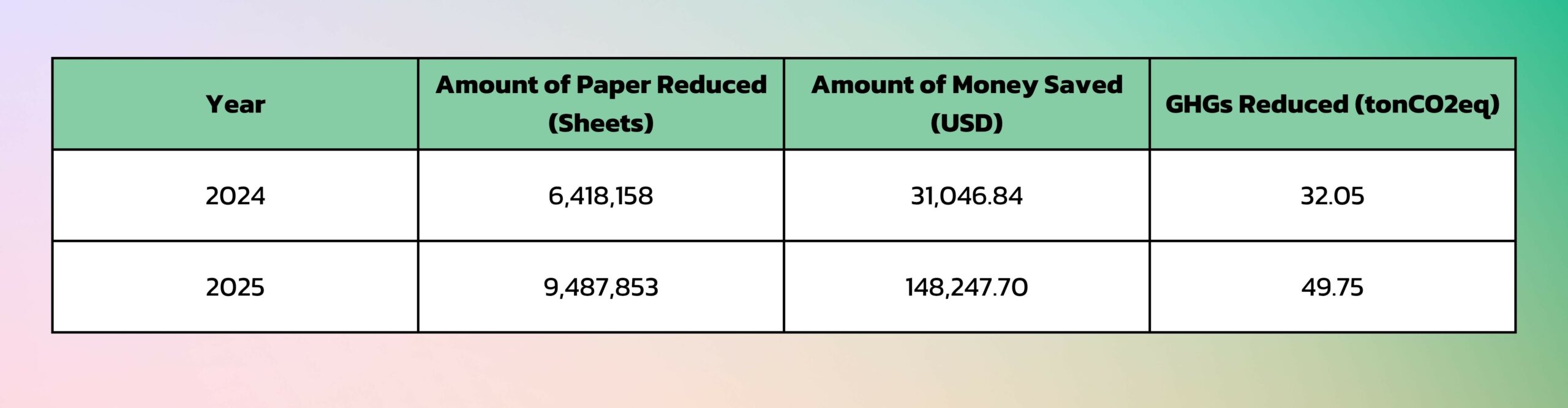 • Greenhouse Gases (GHGs) Reduced: The reduction in paper usage resulted in the mitigation of 49.75 tons of CO₂ equivalent (tonCO₂eq) emissions