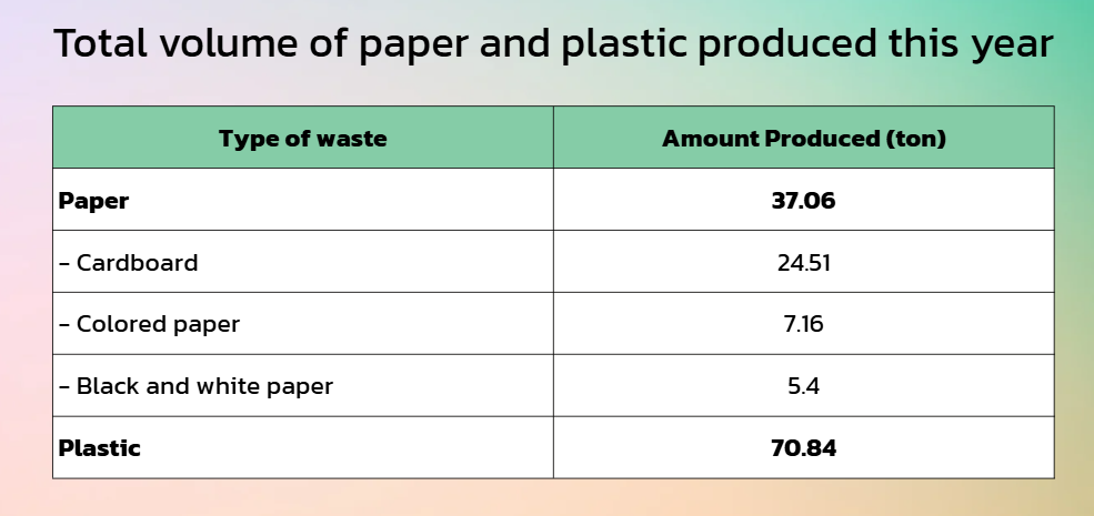 Paper waste primarily originates from office operations, academic units, document printing, and instructional materials. In contrast, plastic waste is mainly derived from food and beverage packaging, plastic bottles, plastic bags, and other wrapping materials resulting from consumption and daily activities within the university.