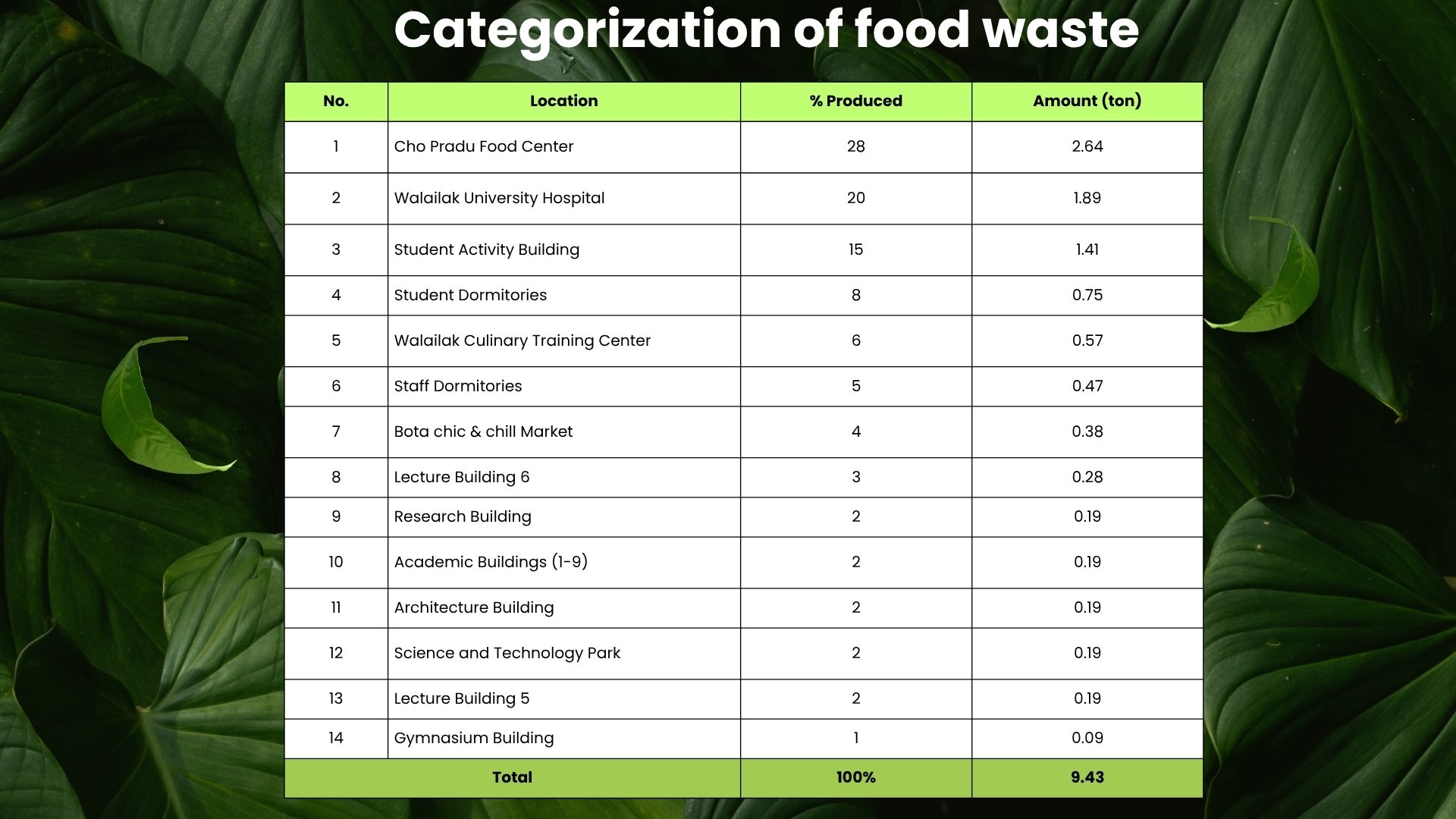 The total amount of organic waste at Walailak University originated from various campus activities, covering food services, landscape maintenance, and general environmental management operations. This organic waste is categorized into three primary types as follows: