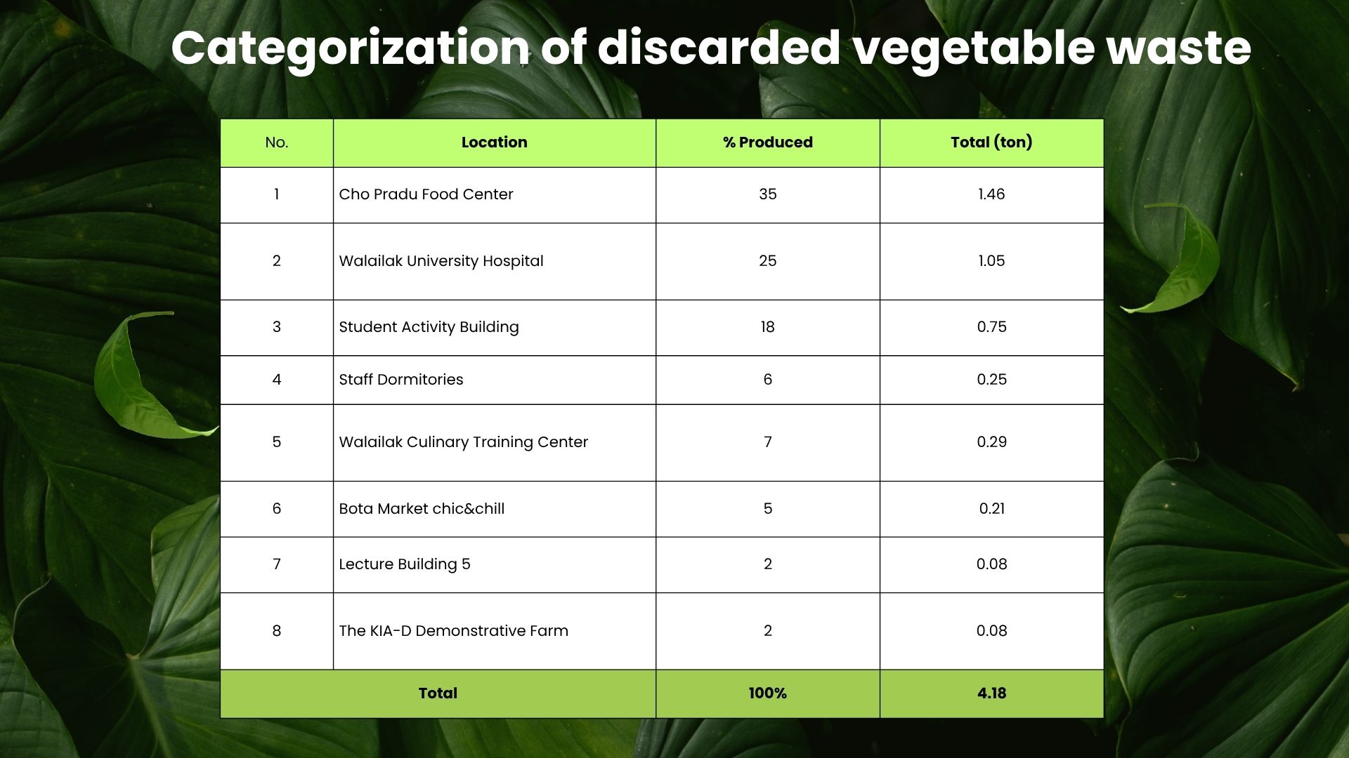 - Discarded Vegetables: Vegetable residues from canteens and the KIA-D Demonstrative Farm within the university, totaling 4.17 tons.