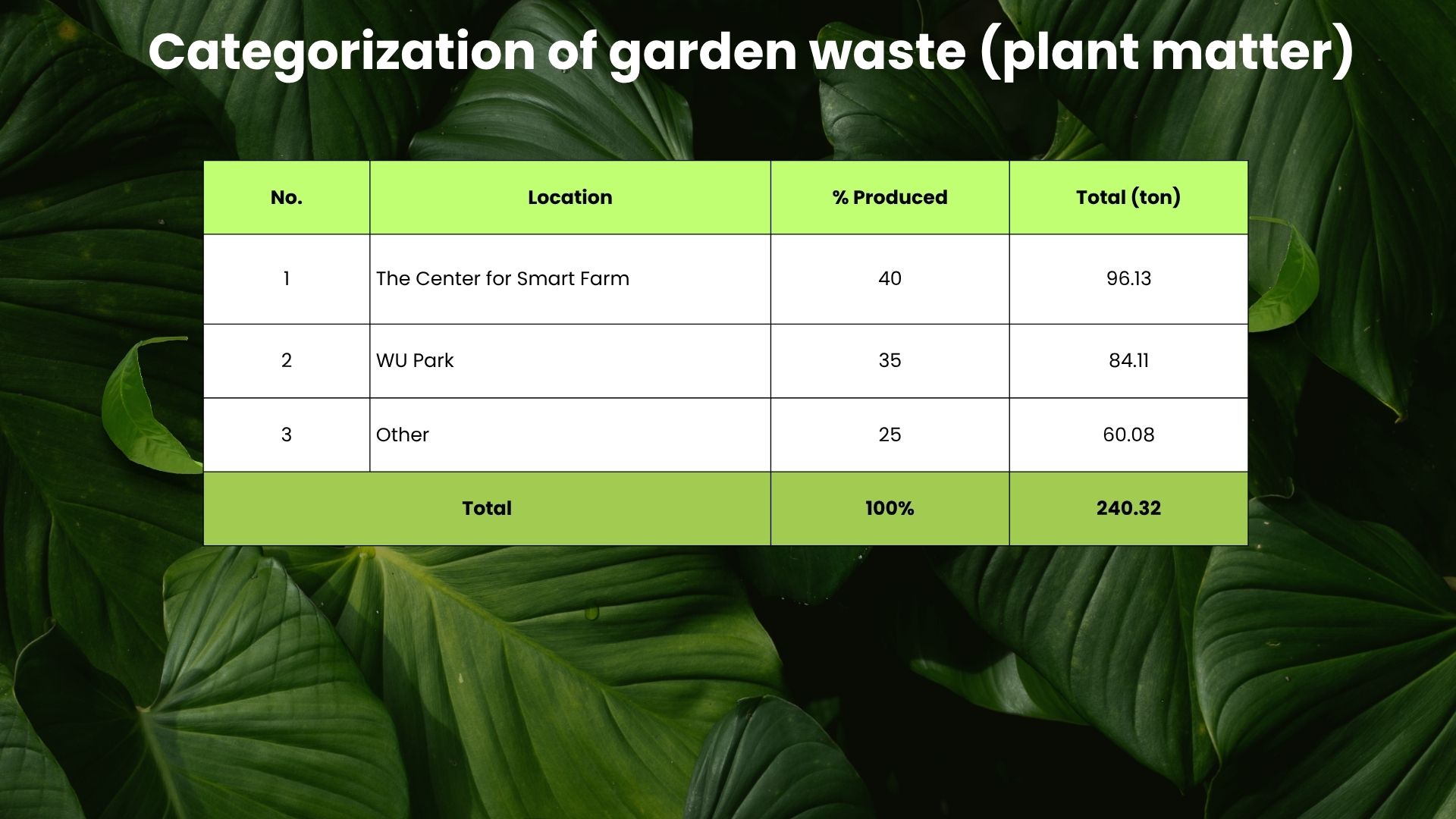 - Garden waste (plant matter): Generated from gardens and landscaped areas of the university, including fallen leaves, pruned branches, and other plant residues, totaling 240.32 tons.