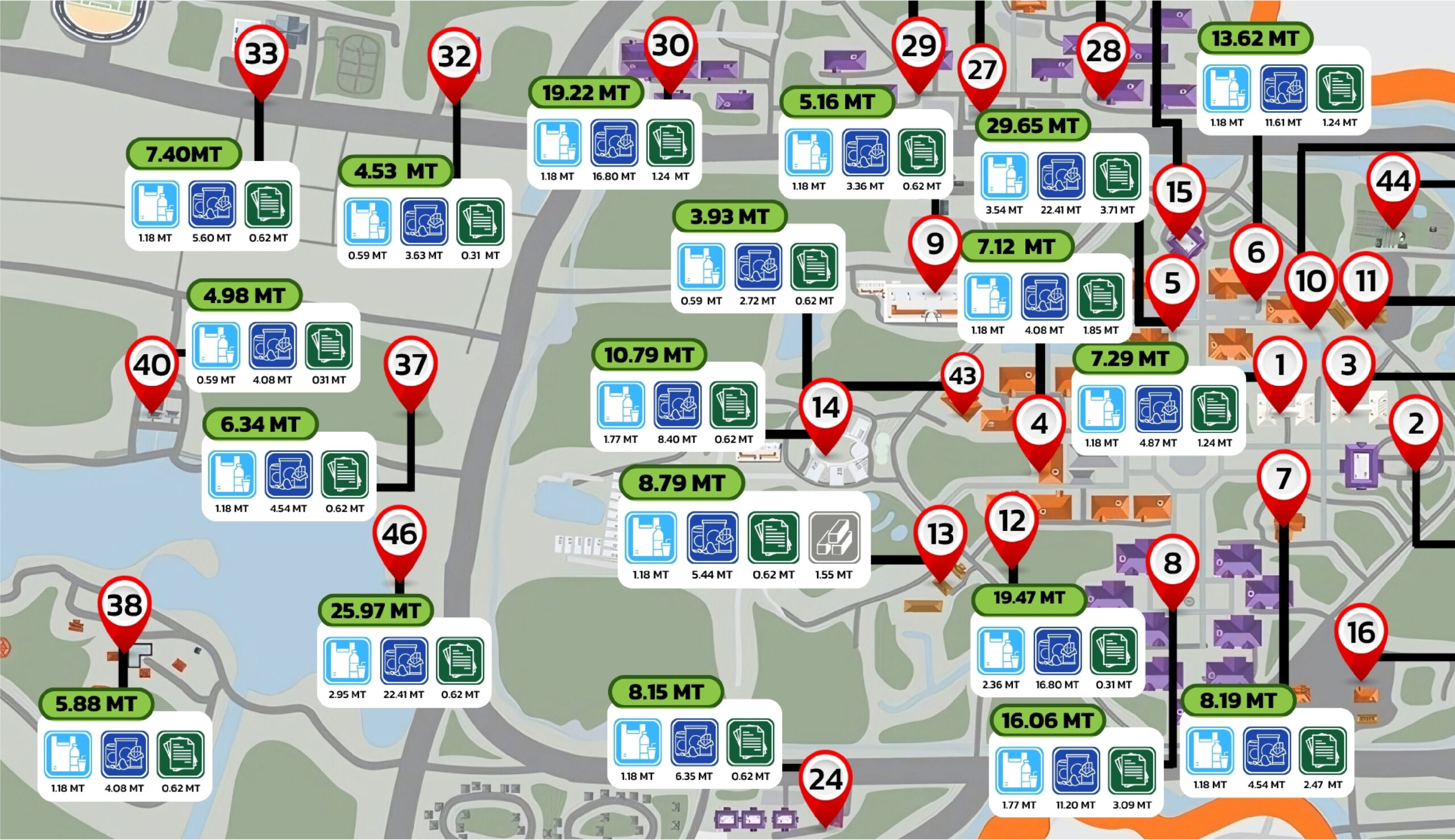 • Metal waste, totaling 2.58 tons, primarily originates from maintenance activities, construction projects, and discarded equipment. This waste stream is recognized as a valuable resource and is systematically directed toward recycling.