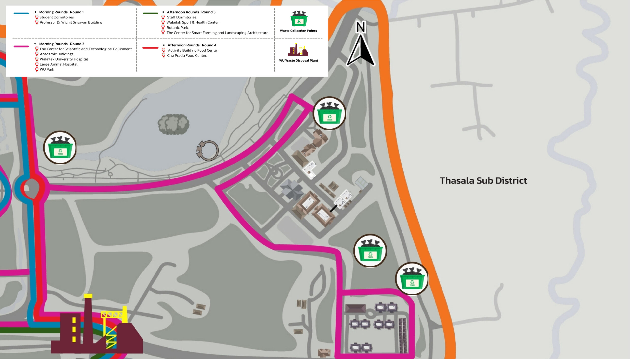 Walailak University has developed a concrete system for managing inorganic waste, guided by the principles of sustainable environmental management and the active participation of all stakeholders within the institution. In terms of management structure, the University has established a spatially detailed waste management map, clearly illustrating points of waste generation, collection, and treatment. Distribution waste bins have been strategically placed at waste generation points to facilitate source separation. In addition, a standardized collection and transportation system has been designed, with specific routes and schedules aligned with the waste volume in each area. This approach enhances transparency, traceability, and systematic evaluation, thereby improving the efficiency of inorganic waste management and supporting the University’s transition toward sustainability.