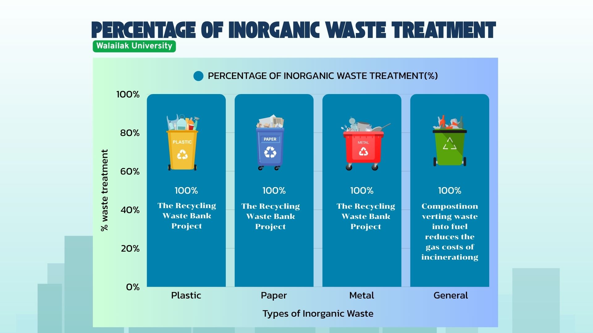 Overall, Walailak University’s inorganic waste treatment initiatives exemplify a holistic approach to sustainability. They integrate education, resource efficiency, and innovative practices while fostering continuous improvement. By transforming organic waste into valuable resources, the university not only minimizes environmental impacts but also establishes a model of sustainable resource management that can be replicated within the academic community.