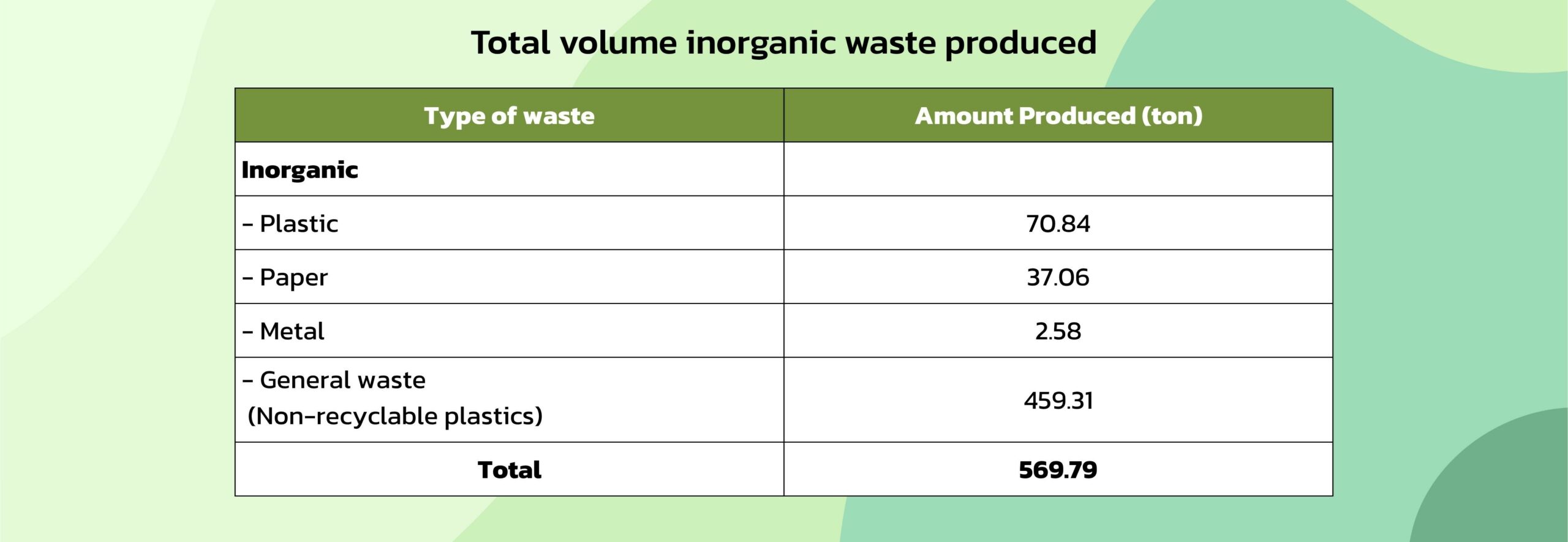 Figure 1 Total volume inorganic waste produced 569.79 ton per year