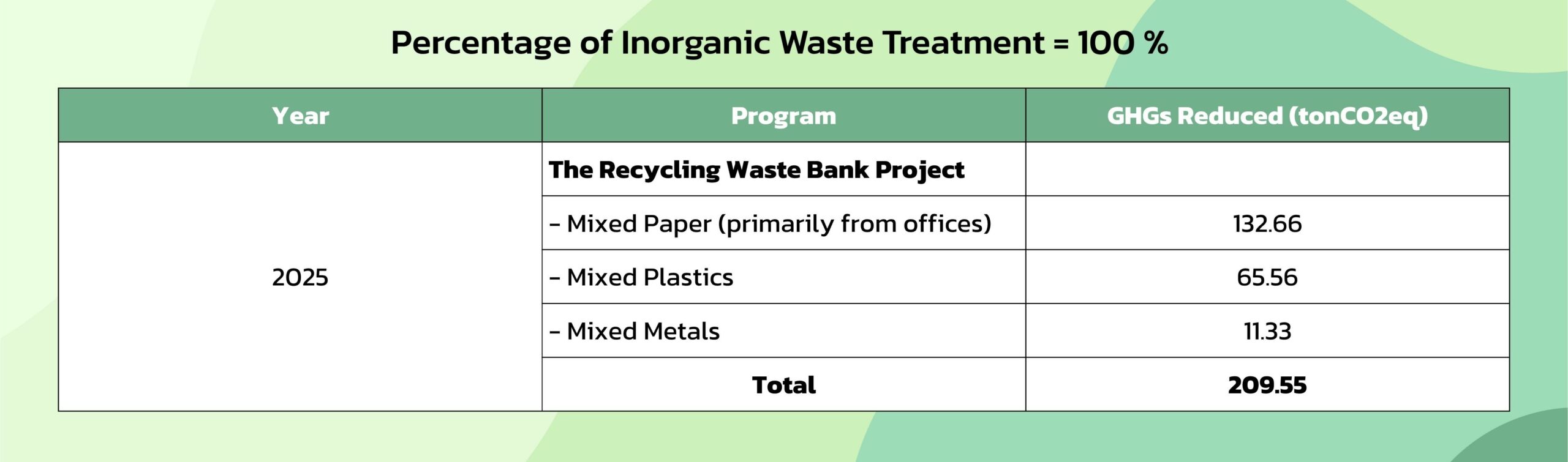 In 2025, the project successfully reduced greenhouse gas emissions by 209.55 tonsCO₂eq This achievement demonstrates tangible environmental benefits and plays a significant role in supporting climate change mitigation through effective waste management practices.