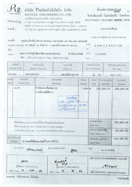 Figure 14 Tax invoice evidence for waste disposal from laboratories at Walailak University, contracted to Recycle Engineering Co., Ltd.