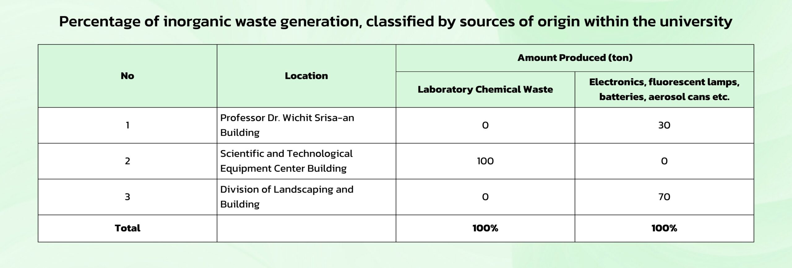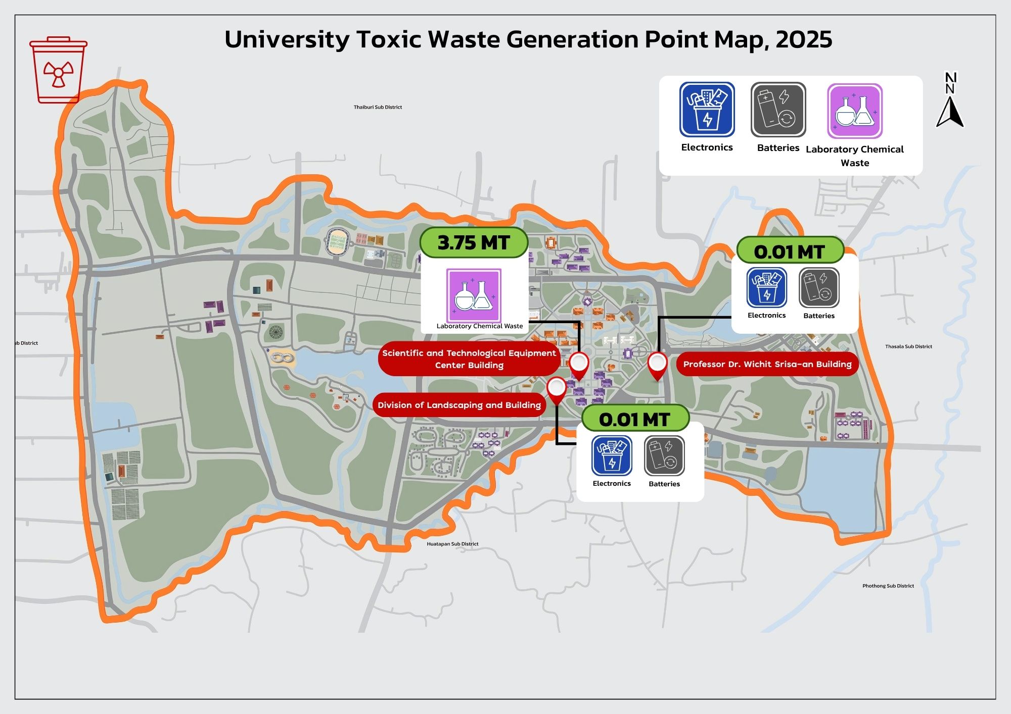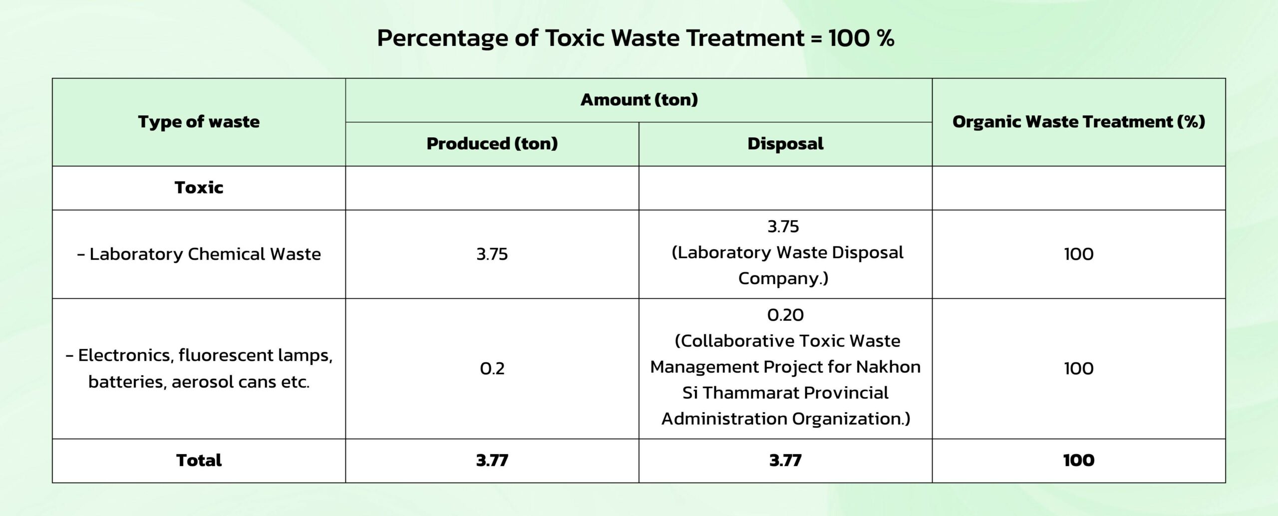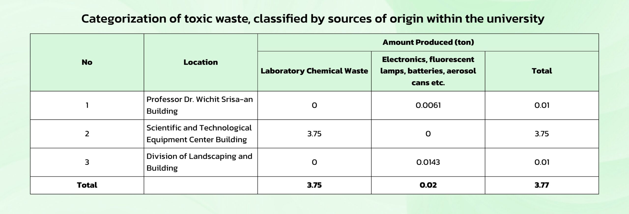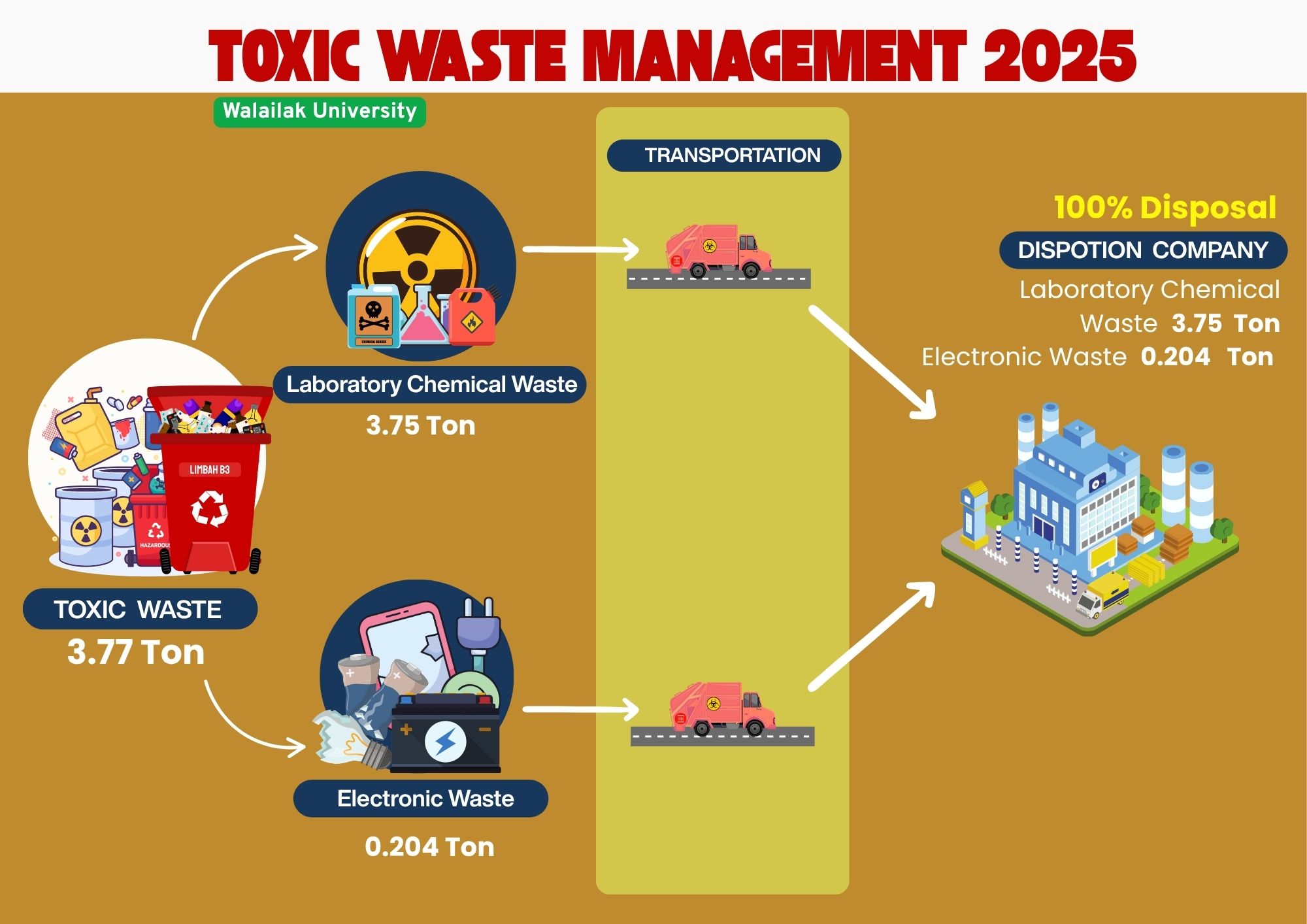 Walailak University has effectively managed hazardous waste. In 2025, the university handled a total of 3.77 tons of toxic waste, divided into the following main categories: