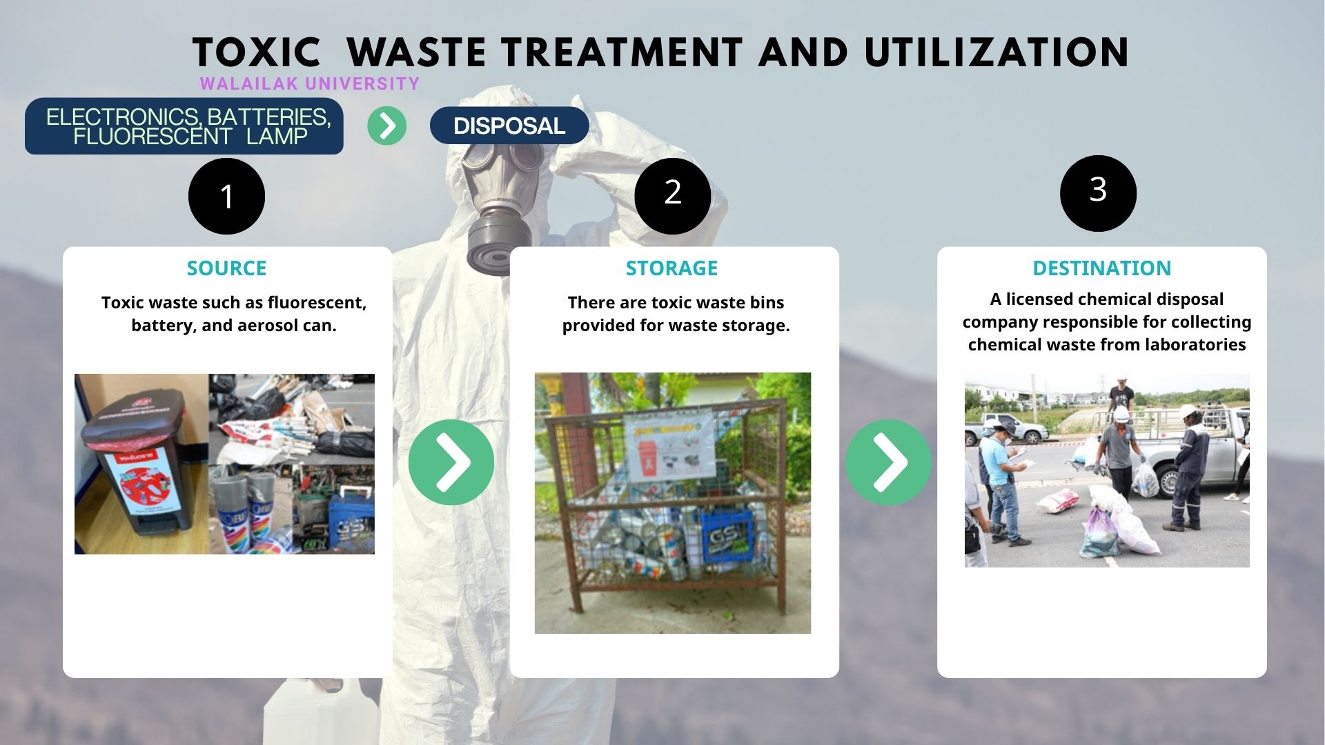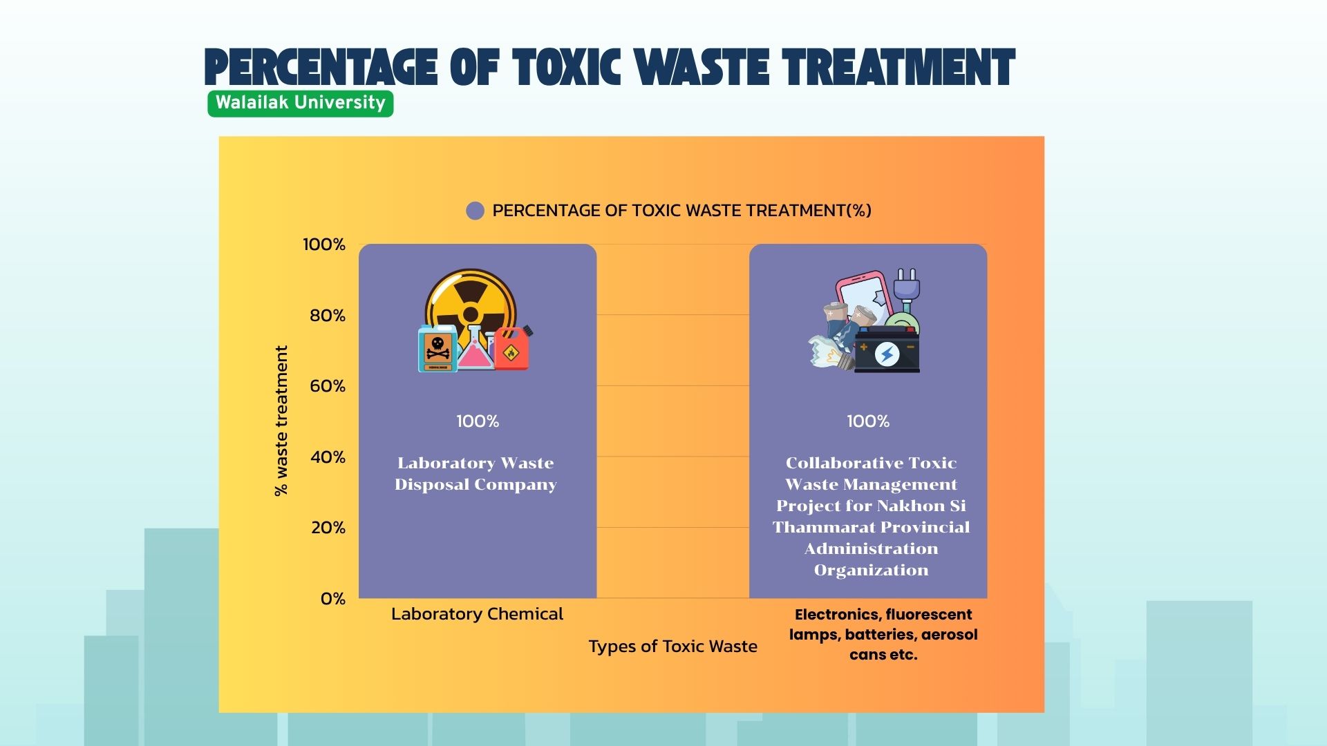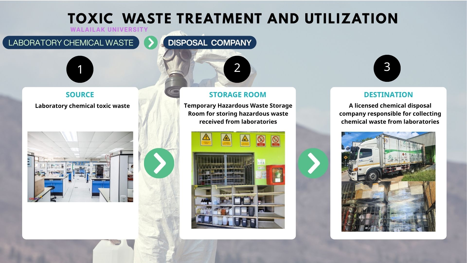 Walailak University places the highest priority on toxic waste management by implementing strict measures to ensure that all processes are conducted safely, scientifically, and in compliance with environmental regulations.