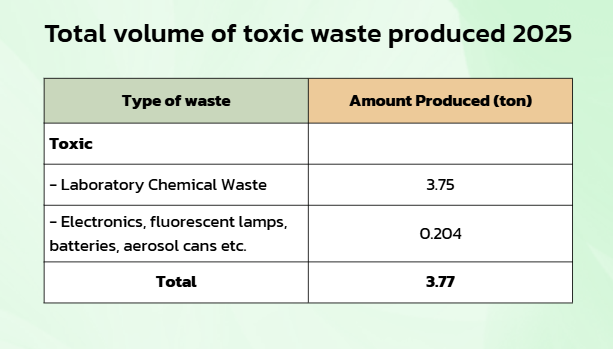 In assessing toxic waste production at Walailak University, the total volume for 2025  amounted to 3.77 tons. The toxic waste produced consists of several categories: