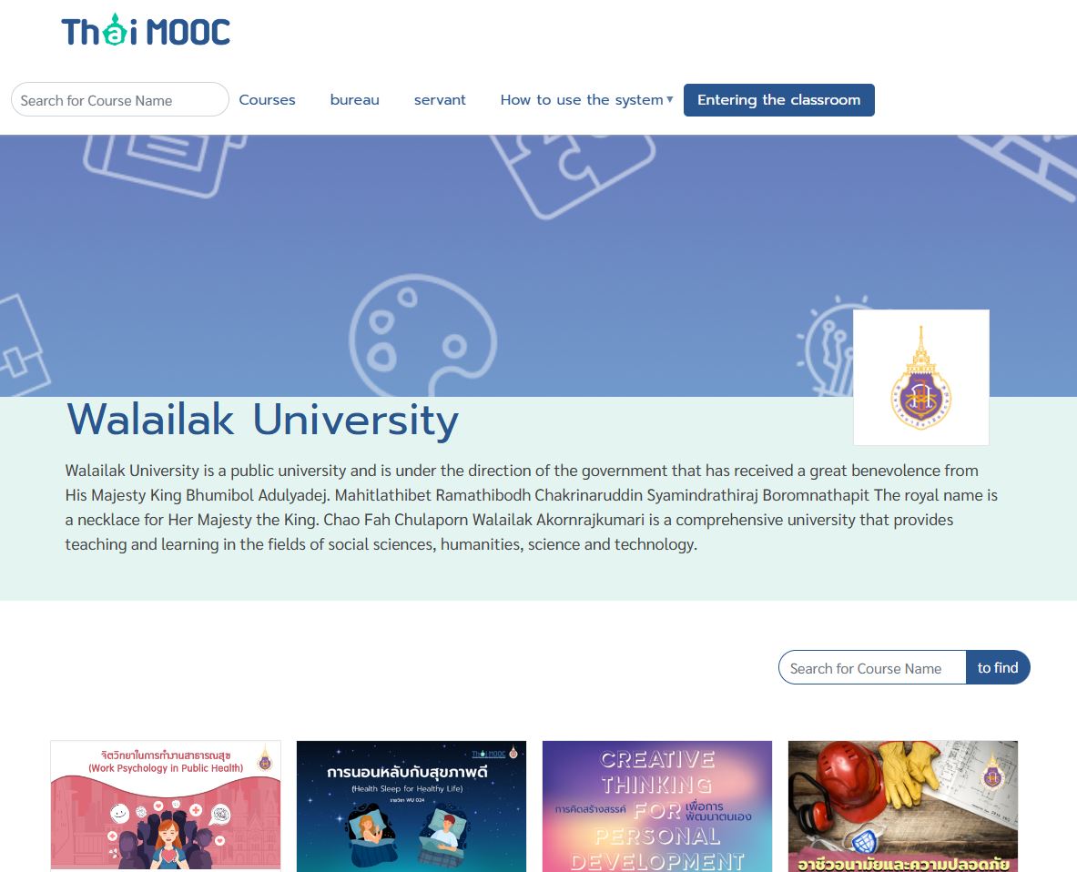 WU MOOC: A free online course aligned with the Sustainable Development Goals (SDGs) and part of the Thai MOOC Learning Management System (LMS) network. Designed for lifelong learning, it empowers learners to upskill and reskill anytime, anywhere, on any device. ‘Thai MOOC’ (Thailand Massive Open Online Course) is a project under the Thailand Cyber University Project (TCU).