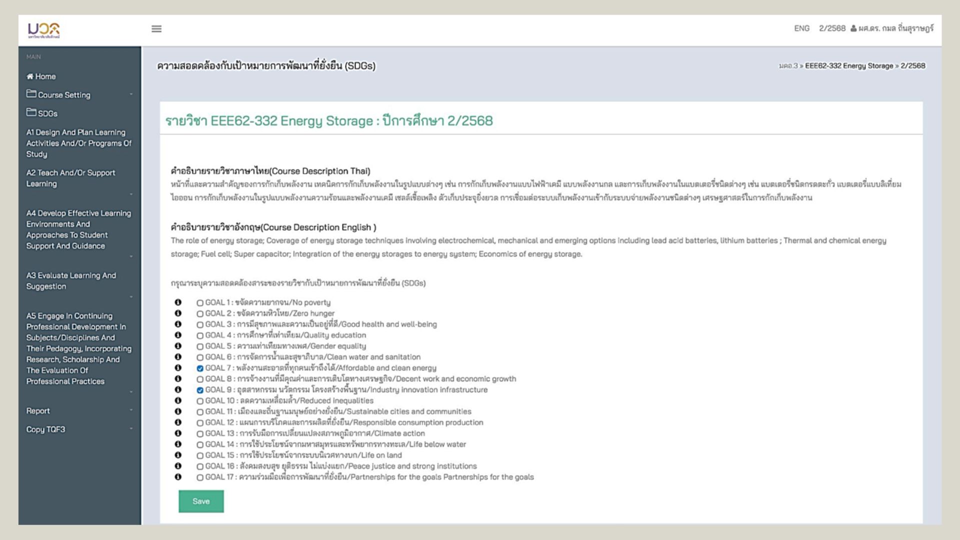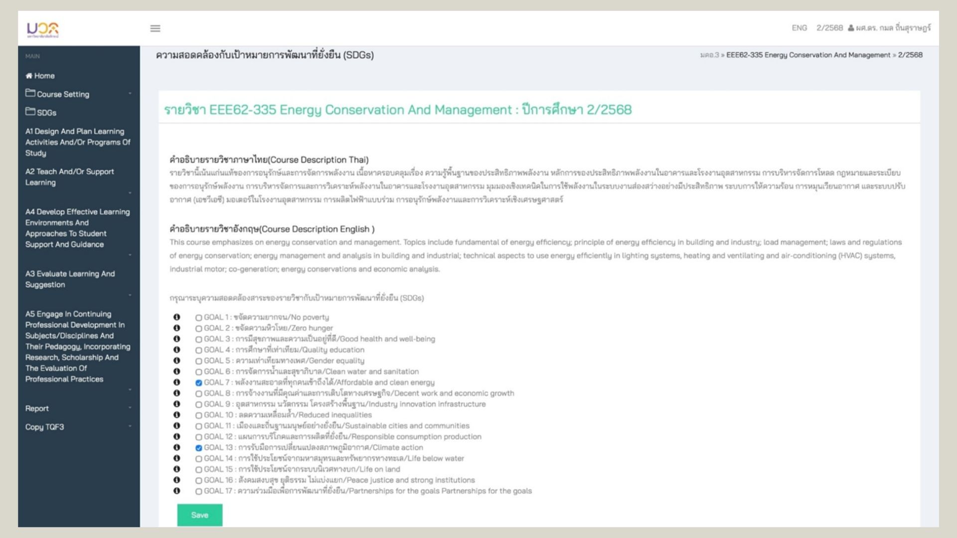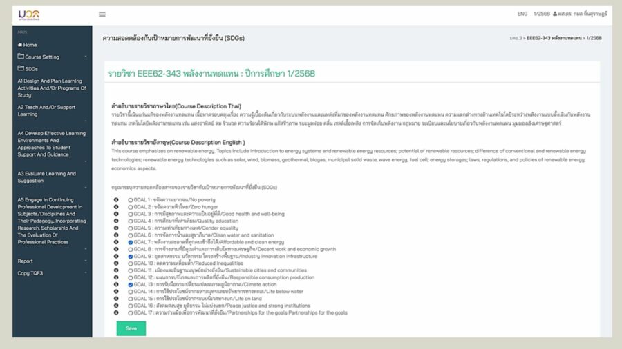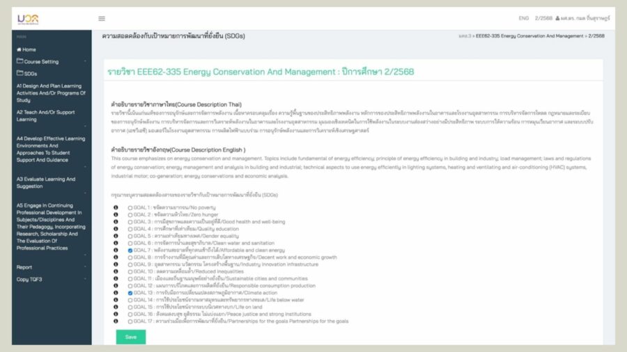 Figure 5 Example : The university adopts the Thai Qualifications Framework for Higher Education (TQF) to standardize curriculum planning and ensure quality education. The TQF system integrates the SDGs as a key component of course requirements in every subject.