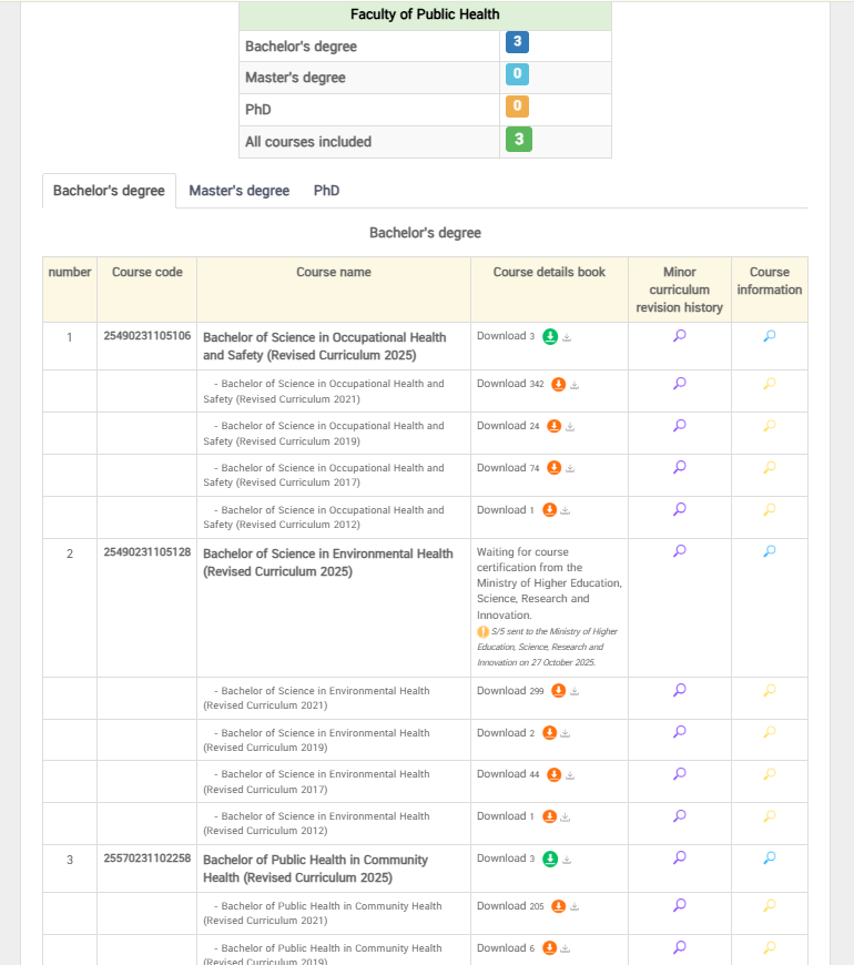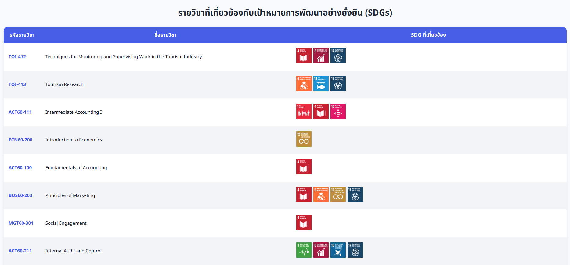 • Social: Courses emphasizing social development, safety, and community participation, such as Safety Occupational Health and Environment Laws, Community Engagement for Schools and Community, and Changes and Complexity of Thai Society.