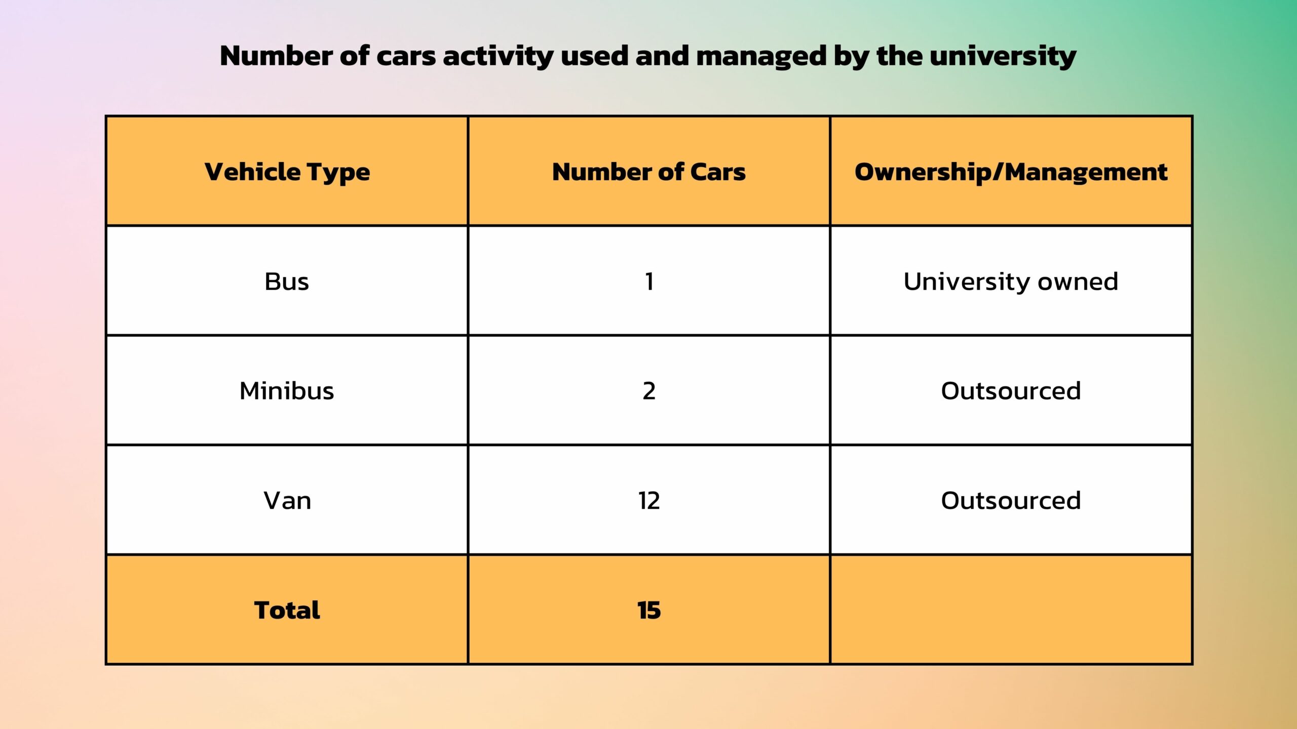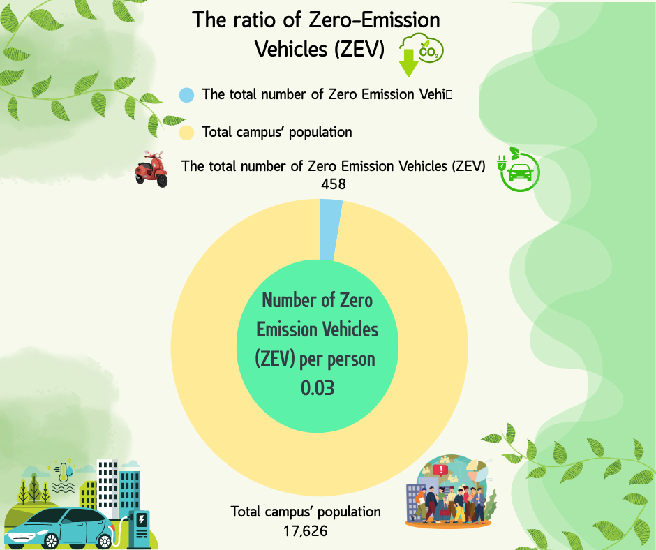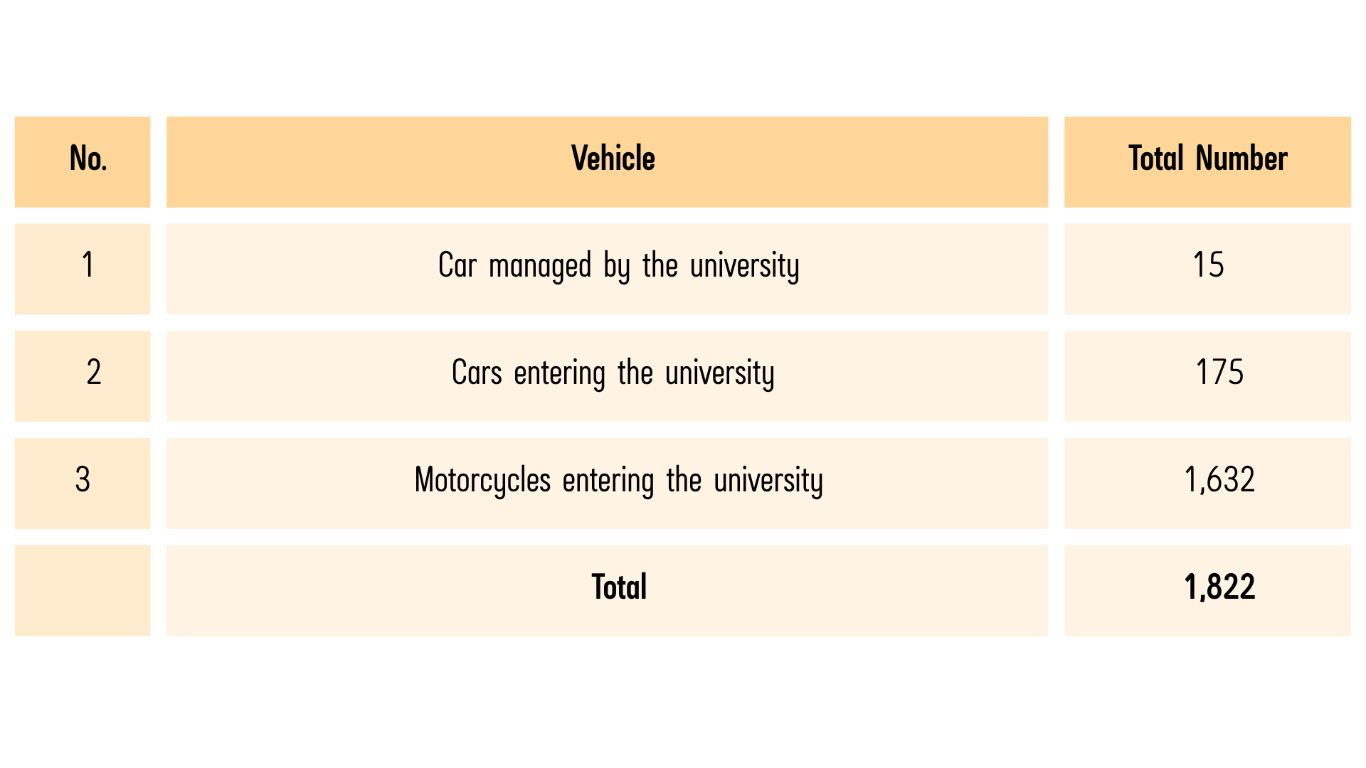 In the 2025 academic year, Walailak University managed a fleet of 15 university-owned cars with combustion engines. Additionally, the university recorded an average of 1,807 vehicles entering and exiting the campus daily, including 175 cars and 1,632 motorcycles. With a total university population of 17,626 people—comprising 14,492 students and 3,134 staff members—the ratio of fuel-powered vehicles to the total campus population was 0.10%, reflecting the university’s ongoing commitment to promoting sustainable transportation and reducing carbon emissions.