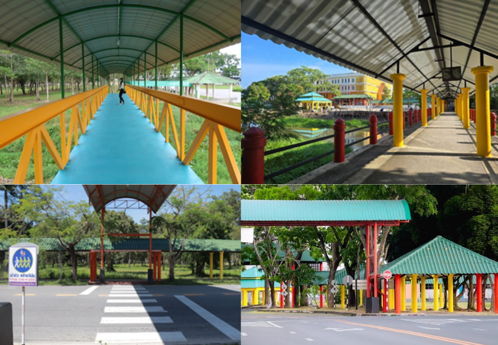 Walailak University encourages students to use bicycles and walk for short-distance travel within the campus. A “Covered Walkway” system has been constructed to connect academic buildings and facilitate safe and convenient pedestrian movement. Walking not only improves personal health but also helps reduce air pollution.