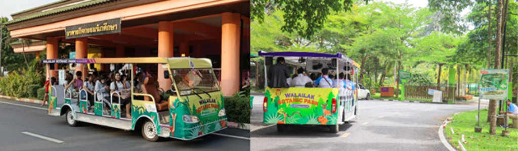 Walailak University has implemented a policy regarding the use of public transportation and private vehicles for students and staff within the campus. All students are required to register their vehicles with the Division of Student Promotion and Development. Only electric bicycles, electric motorcycles, and electric cars are permitted for registration. In addition, the university provides a comprehensive public shuttle service that covers key areas across the campus, including dormitories, sports complexes, the hospital, the library, and Walailak Park. This policy aims to promote sustainable mobility by encouraging the use of environmentally friendly vehicles and reducing greenhouse gas emissions from transportation.