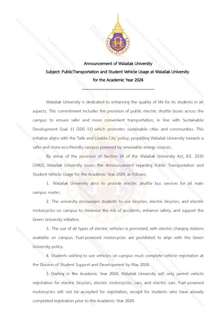 Walailak University has established a comprehensive policy to reduce the use of private vehicles within its campus. The policy promotes the use of public transportation, carpooling for those traveling along the same routes, and the adoption of electric vehicles. It also includes measures to control the number of vehicles entering the campus through a University Access Card system, as well as the improvement of pedestrian and bicycle pathways to ensure user safety and convenience. These initiatives aim to enhance environmental sustainability, reduce air pollution, and create a safe and eco-friendly transportation environment for students, faculty, and staff. The key initiatives are as follows:
