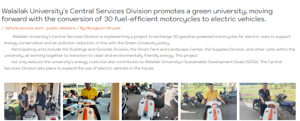- Walailak University promotes the use of public transportation and electric vehicles to reduce emissions. Charging stations for electric vehicles have been installed throughout the campus to support convenient use of electric mobility.